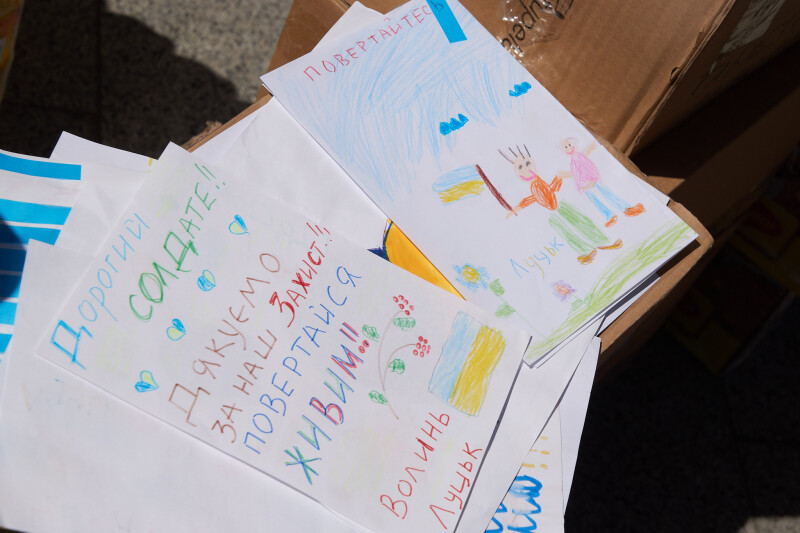 Осторонь від події, як завжди, не залишилися діти. Їхні малюнки з побажаннями бійцям повернутися додому живими і здоровими також отримають у бригаді. І будуть ще завзятіше боронити рідну землю, адже захищають маленькі серця, які вірять в українську перемогу.