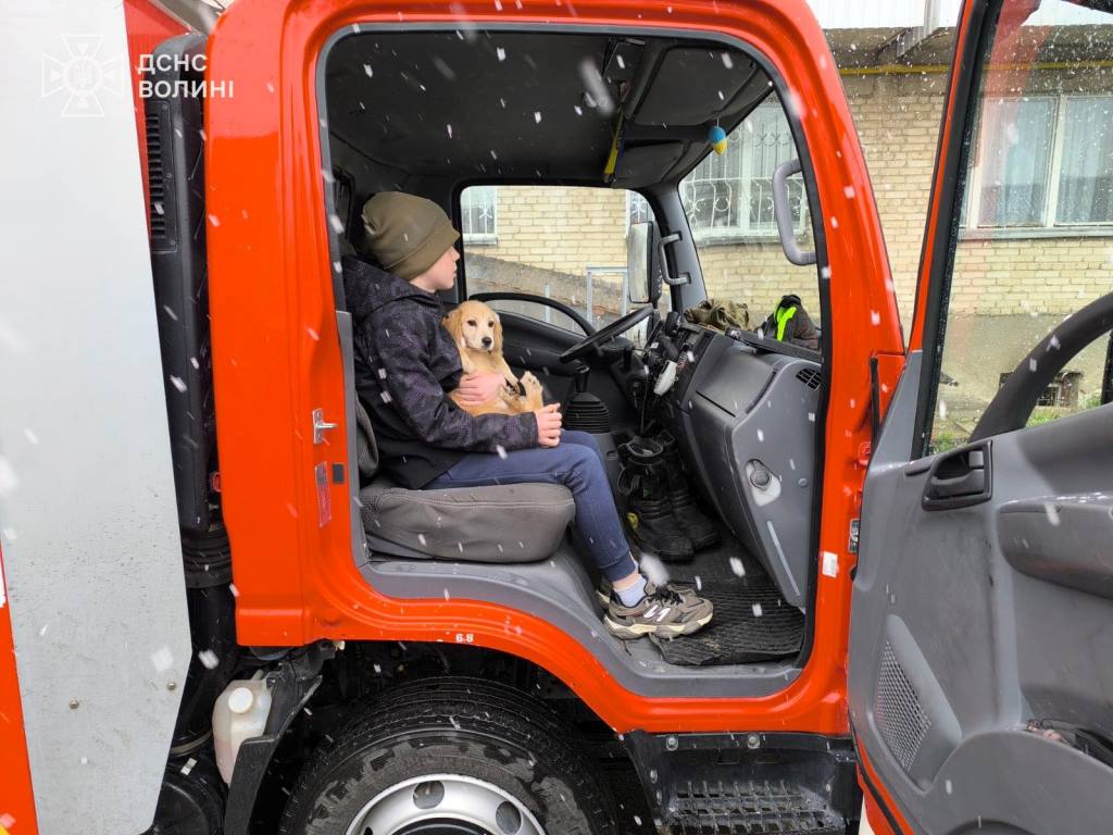 Через задимлення з підвалу йому було небезпечно залишатись вдома, тому рятувальники евакуювали його з песиком з квартири і до приїзду мами він чекав її в кабіні пожежного автомобіля.