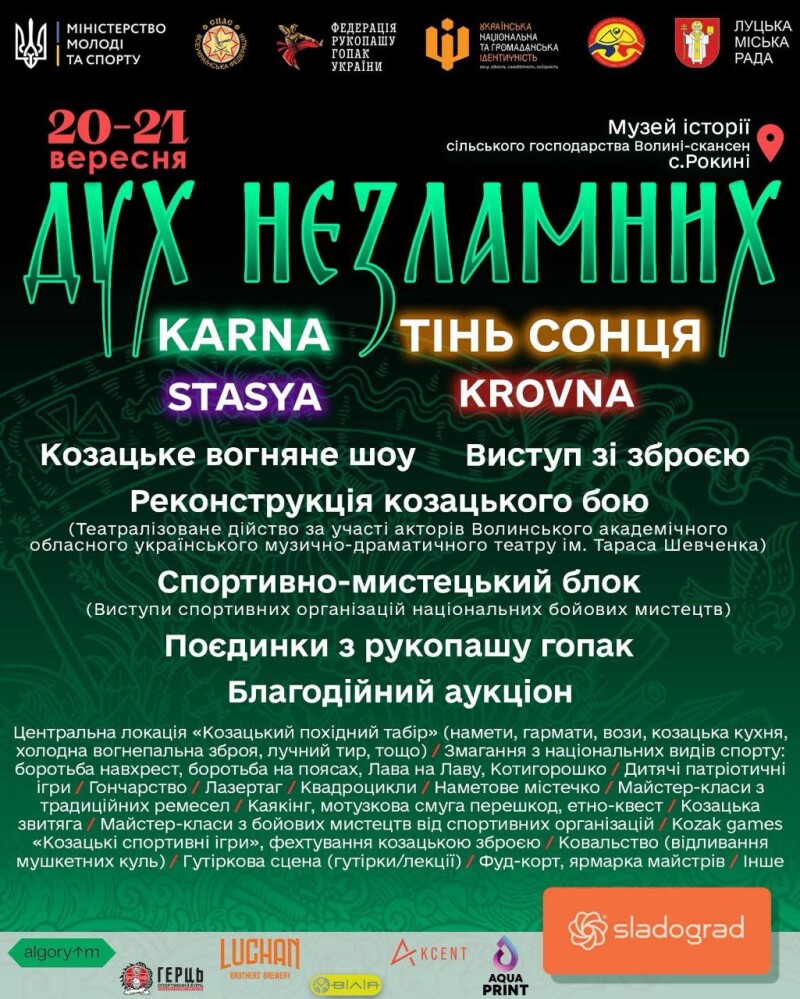 20 та 21 вересня мешканців та гостей Луцької громади запрошують взяти участь у фестивалі «Дух незламних». Захід відбуватиметься на території Музею історії сільського господарства Волині-скансен у селі Рокині.