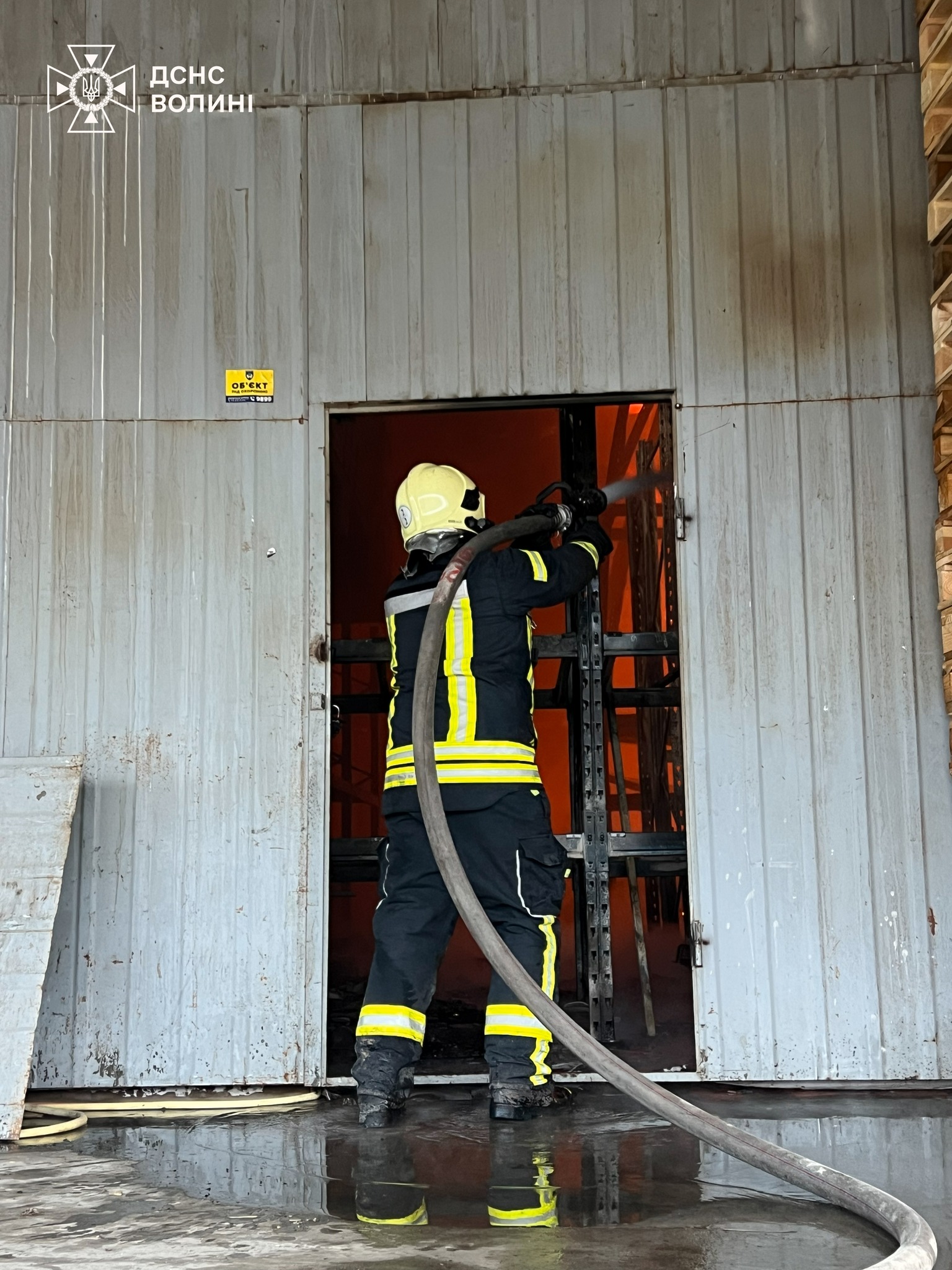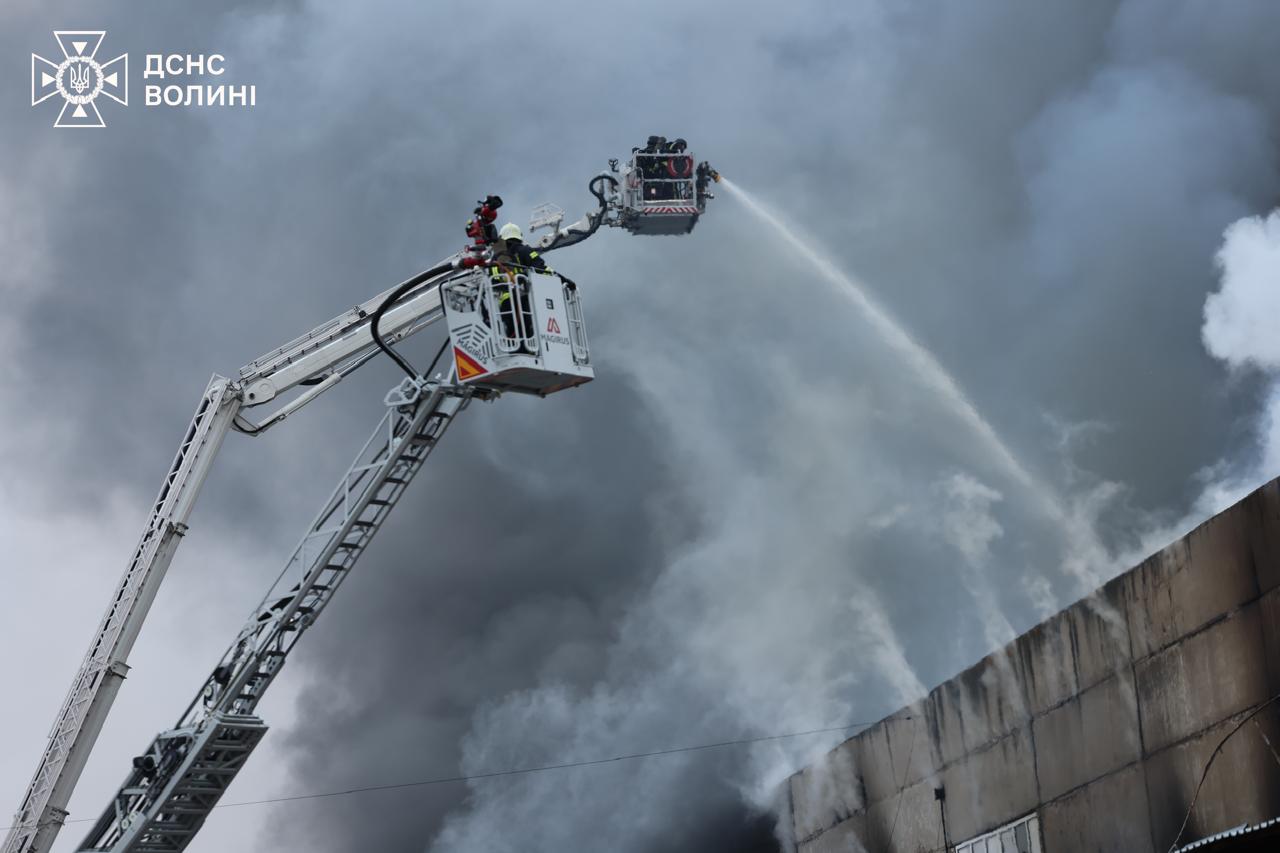 У Луцьку внаслідок ворожого обстрілу зайнялася цивільна складська будівля. У приміщеннях, де зберігаються продукти харчування, виникла пожежа.