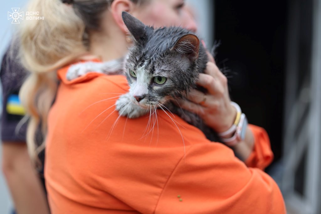 З’ясувалося, що пожежа виникла в одній з кімнат. Господарів вдома не було, проте, за свідченням сусідів, усередині були домашні тварини. Рятувальники віднайшли в одній з кімнат кота Любарта, якого господар врятував під час обстрілу на Сході, а ще за трохи із задимленої оселі визволили й собаку Ская. На жаль, ще один котик задихнувся в диму.