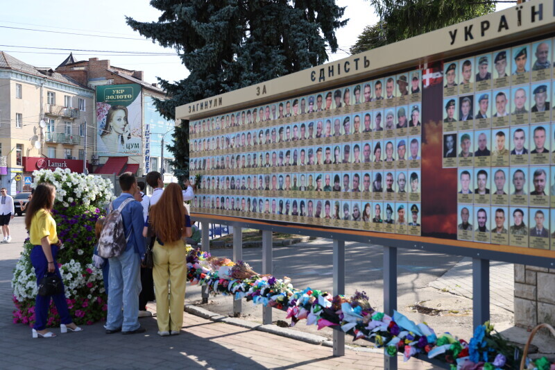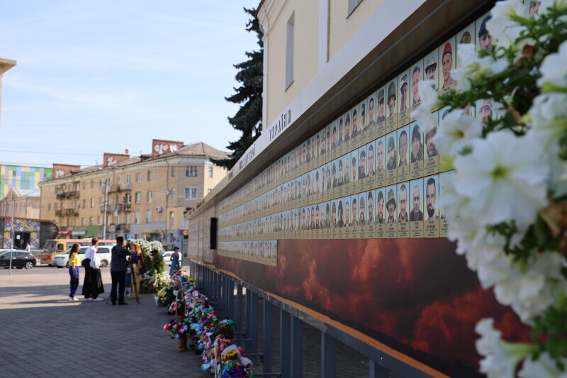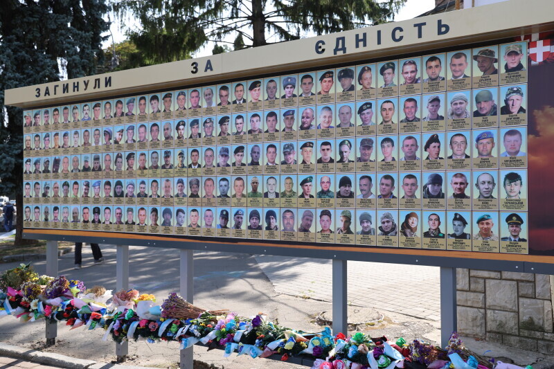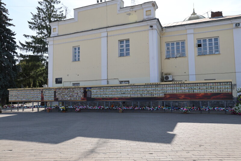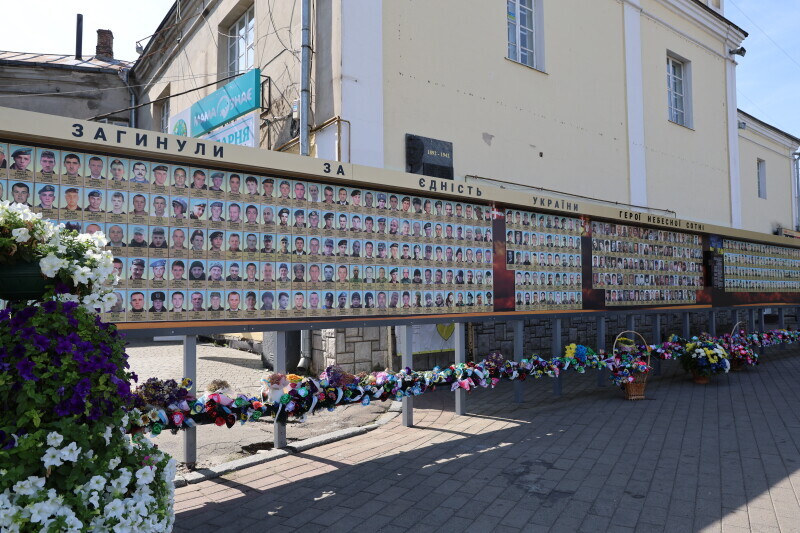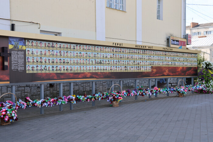За десять років, на жаль, він кілька разів розширювався. Його довжина тепер складає понад 22 метри. Загалом тут розміщені більше 560 світлин наших воїнів та цивільних громадян, які віддали своє життя за Україну. Фотостенд складається з трьох частин “Небесна сотня”, “Загинули за єдність України” та “Герої нескореної України”.