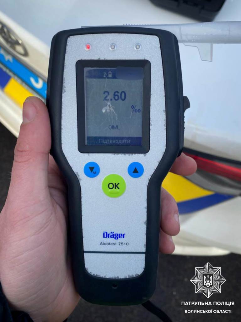 Під час спілкування з водієм інспектори виявили у нього ознаки алкогольного спʼяніння. Чоловік погодився пройти освідування на місці події. Результат огляду на приладі Драгер становив 2,6 проміле, що перевищує максимально допустиму норму в 13 разів.