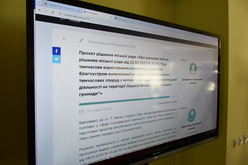 У конференц-залі департаменту ЦНАП відбулося громадське обговорення регуляторного акту – проєкту рішення Луцької міської ради “Про внесення змін у рішення міської ради “Про тимчасове користування окремим елементами благоустрою комунальної власності для розміщення тимчасових споруд з метою провадження підприємницької діяльності на території Луцької міської територіальної громади”.