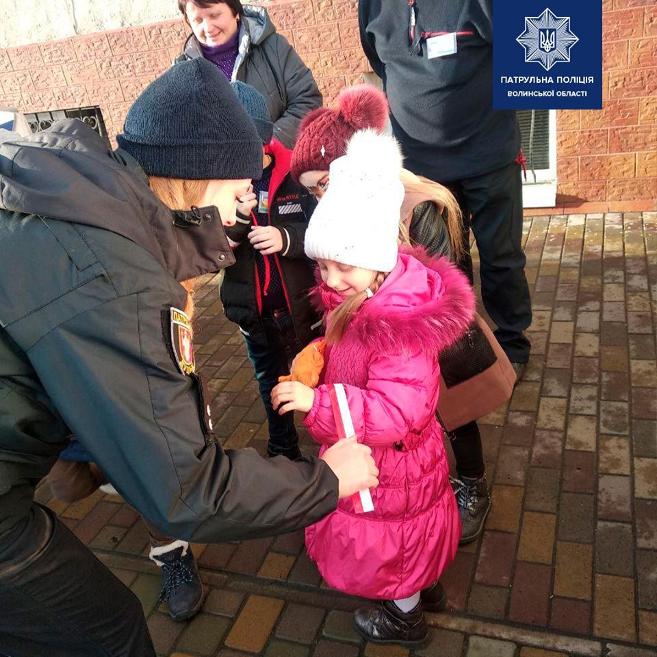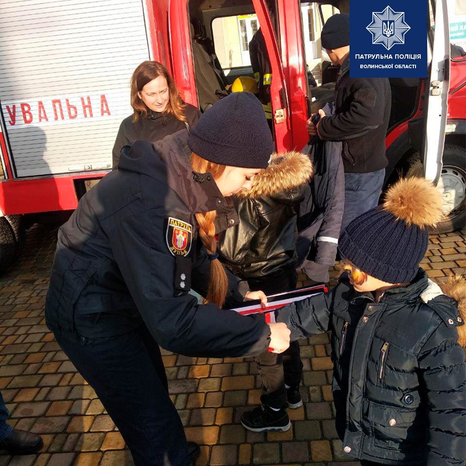 Малюкам показали спецзасоби та дозволили посидіти в службовій автівці. Також їм подарували світловідбивні браслети, аби були помітними в темну пору доби.
