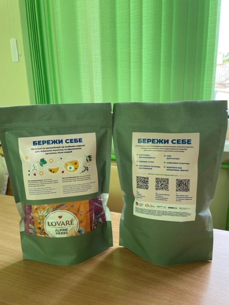 Також в межах проекту закупили вітамінний імуностимулюючий чай для осіб похилого віку, які мали ускладнення внаслідок Covid-19 (1000 шт.). На упаковках чаю розмістили інформаційні наліпки.