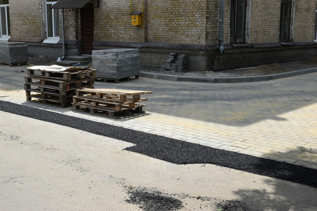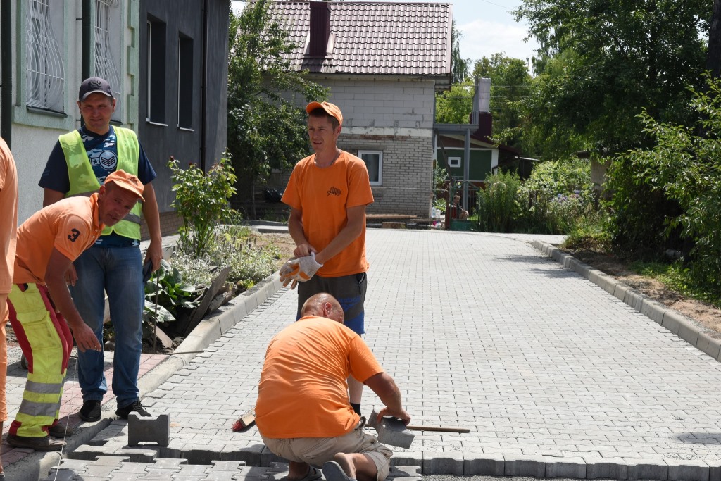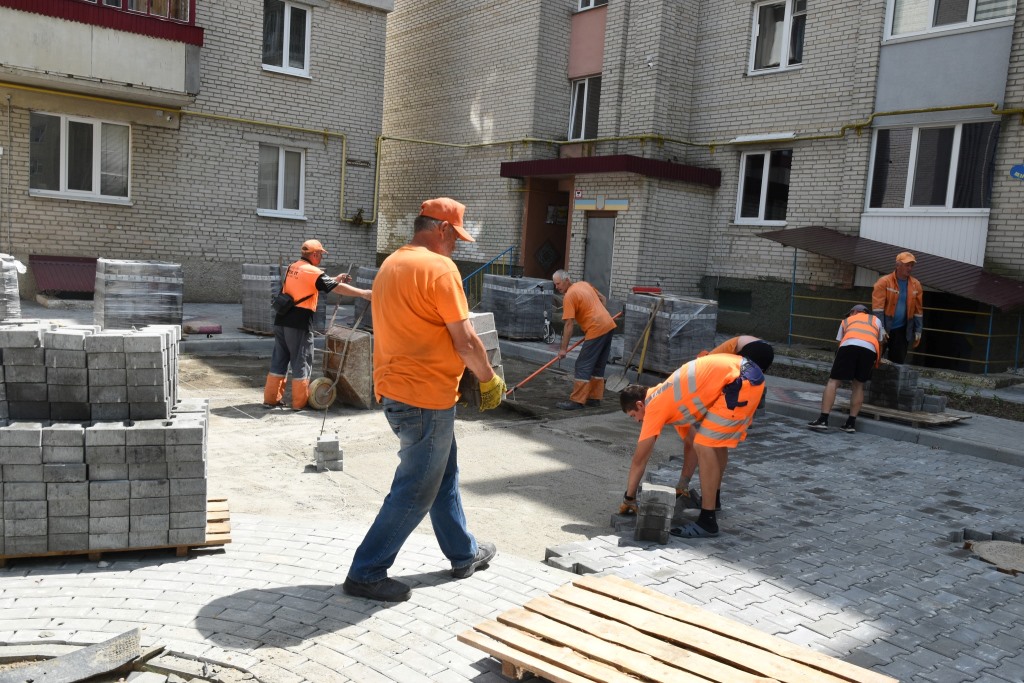 Працівники тут вимощують бруківкою територію дворів та облаштовують майбутні паркомісця.