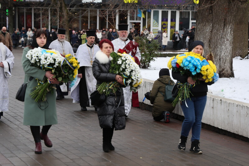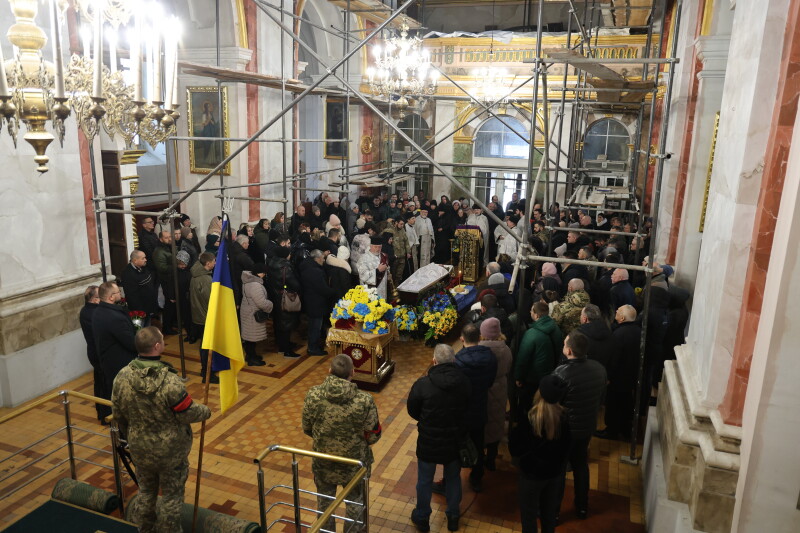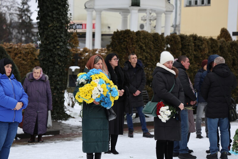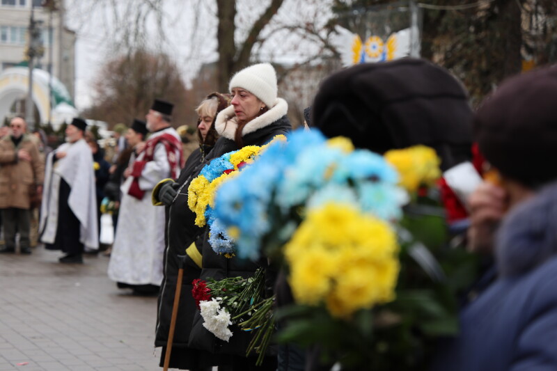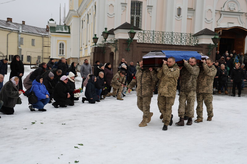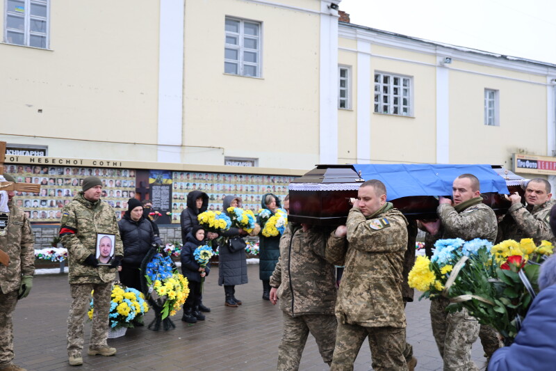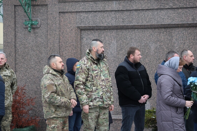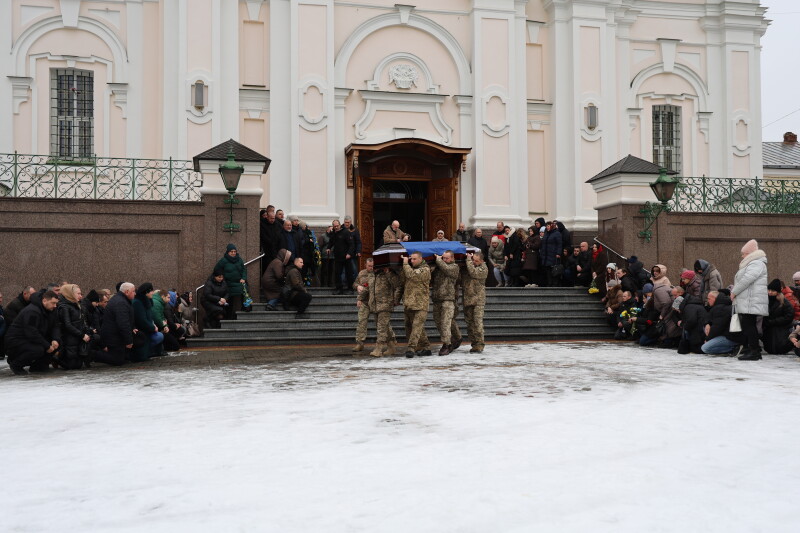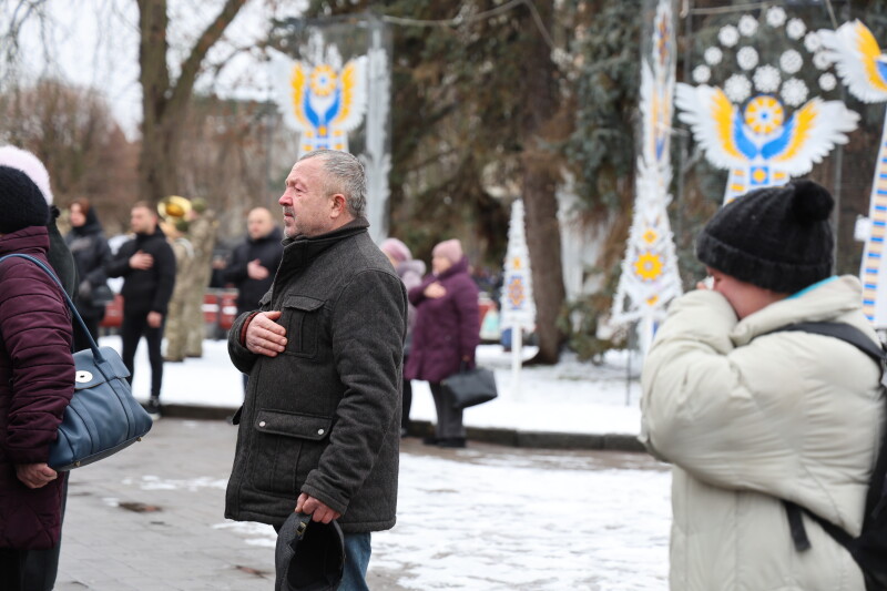 Після завершення богослужіння труну з тілом покійного захисника пронесли Театральним майданом. Біля пам’ятного фотостенда загиблим Героям присутні зупинилися і виконали Державний Гімн України.