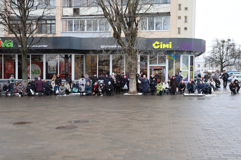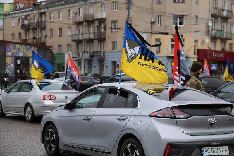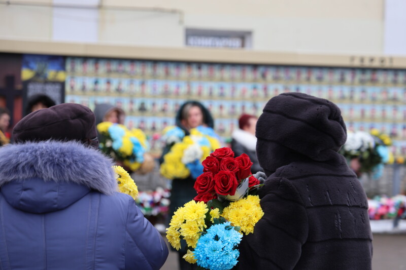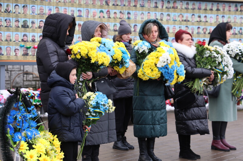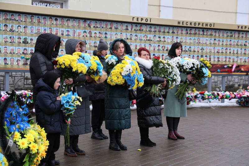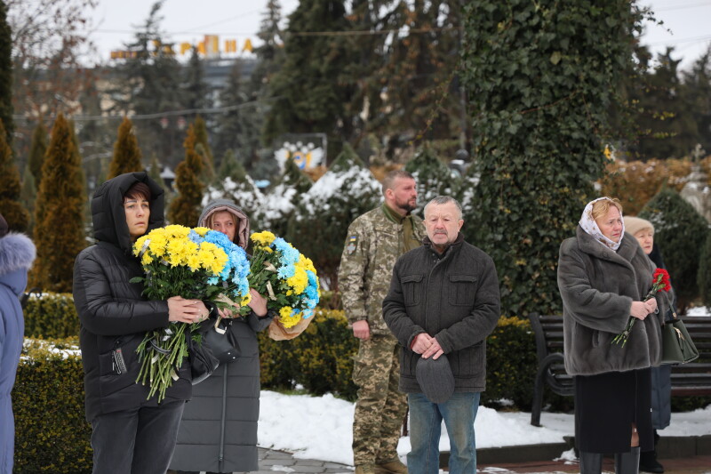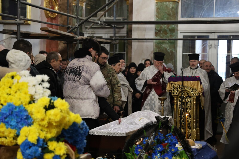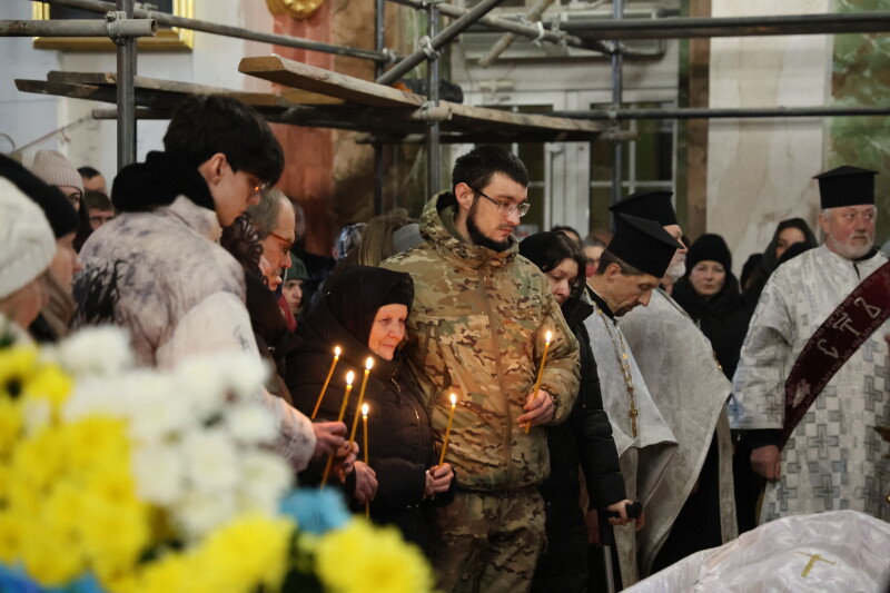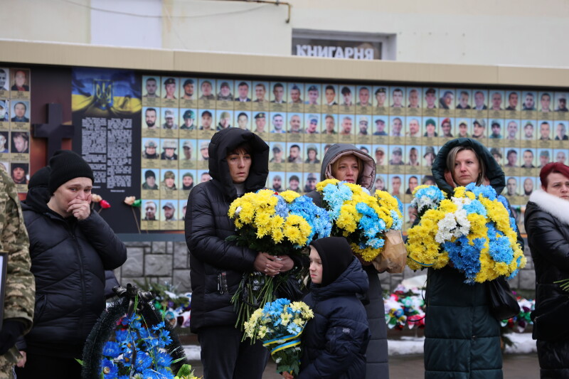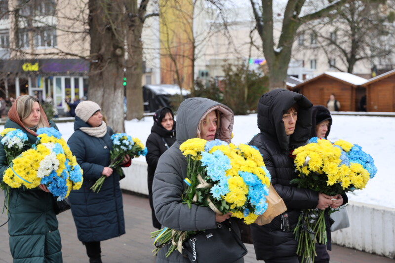 Після завершення богослужіння труну з тілом покійного захисника пронесли Театральним майданом. Біля пам’ятного фотостенда загиблим Героям присутні зупинилися і виконали Державний Гімн України.