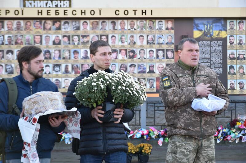 Біля фотостенда пам’яті загиблих Героїв траурна процесія зупинилася і виконала Державний Гімн України.