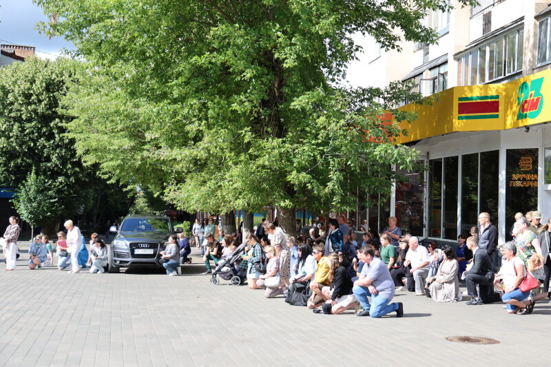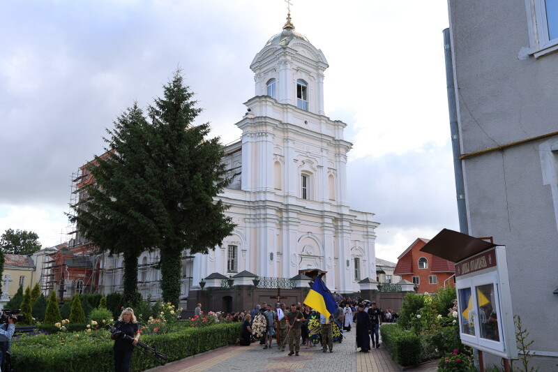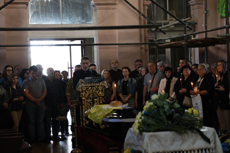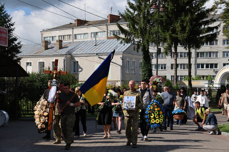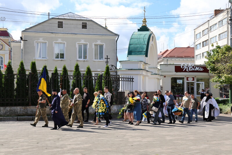Після завершення богослужіння труну з тілом покійного захисника пронесли Театральним майданом. Біля пам’ятного фотостенду “Герої Небесної Сотні – Загинули за Єдність України” присутні зупинилися і виконали Державний Гімн України.
