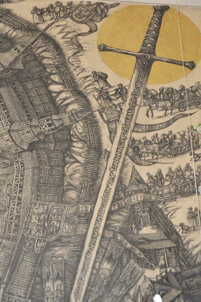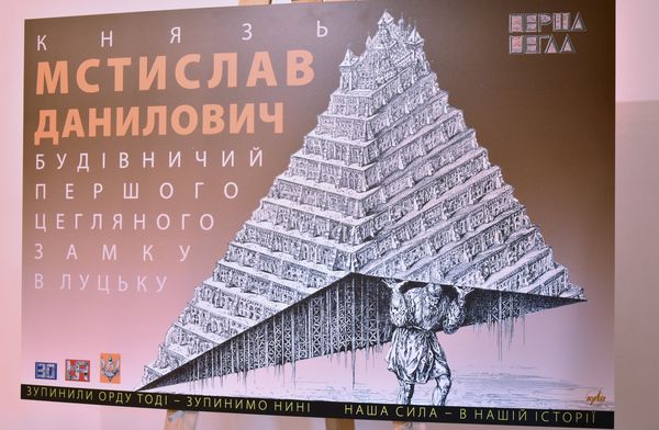 Окремим розділом на виставці представлена серія історичного плакату та святкових хоругов під назвою «Перша цегла. Луцькому замку 730 років». Версію про те, що цегляний на місці дерев’яного Луцький замок закладено князем Мстиславом Даниловичем наприкінці 13 століття озвучили місцеві археологи ще 10 років тому. Ця суперечить офіційному твердженню, що будівництво замку розпочав Любарт у 14 столітті. На підтримку гіпотези луцьких науковців луцькі митці і започаткували цей художній проект. Його ідея – у переосмисленні далекого минулого українського народу, відображенні у сучасному мистецтві його славної історії та славетних постатей.