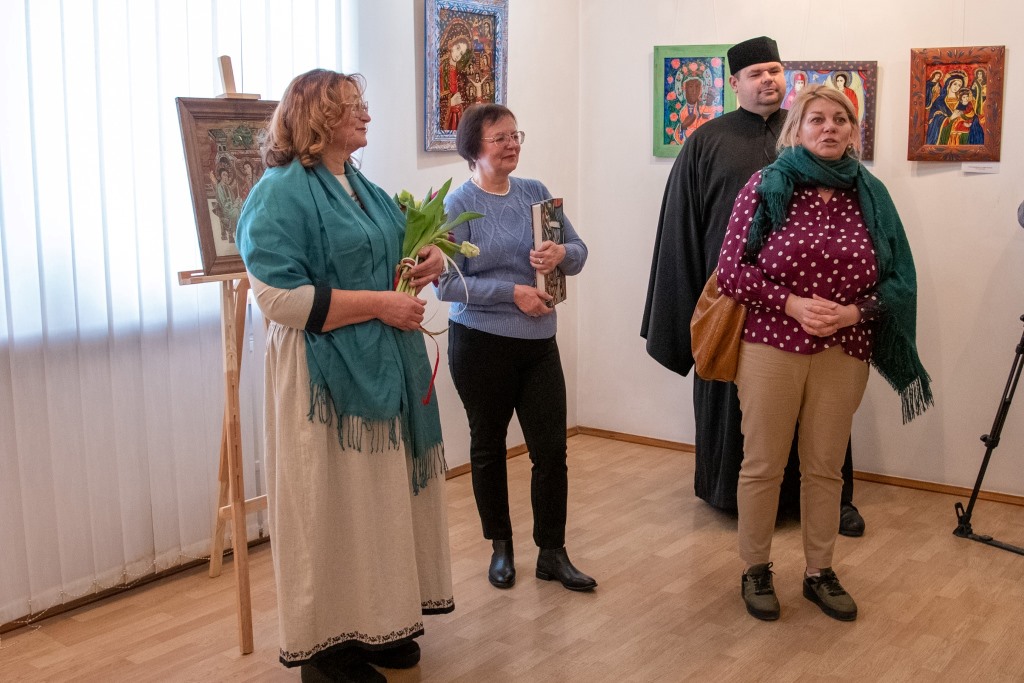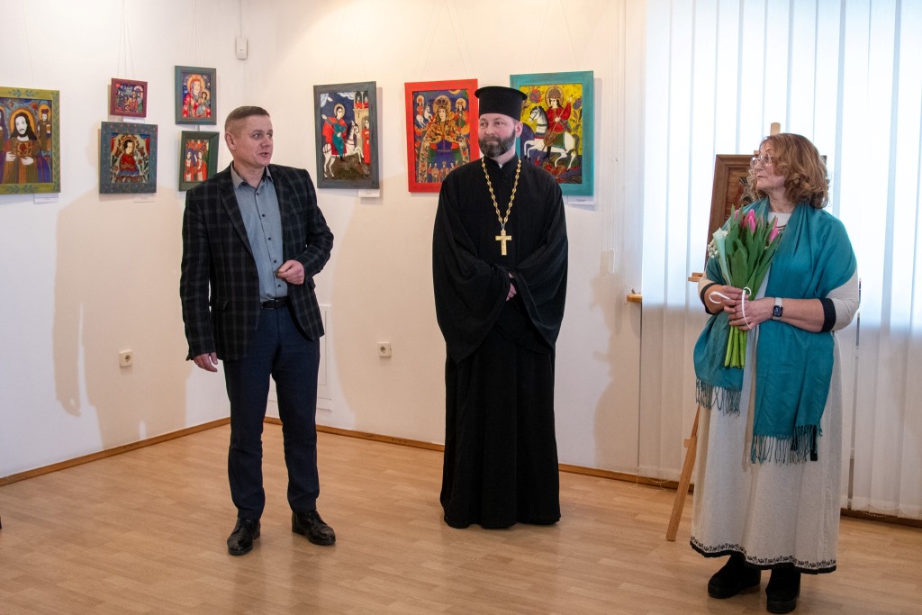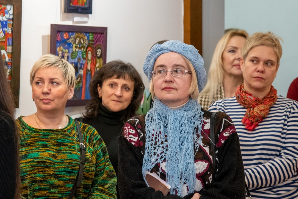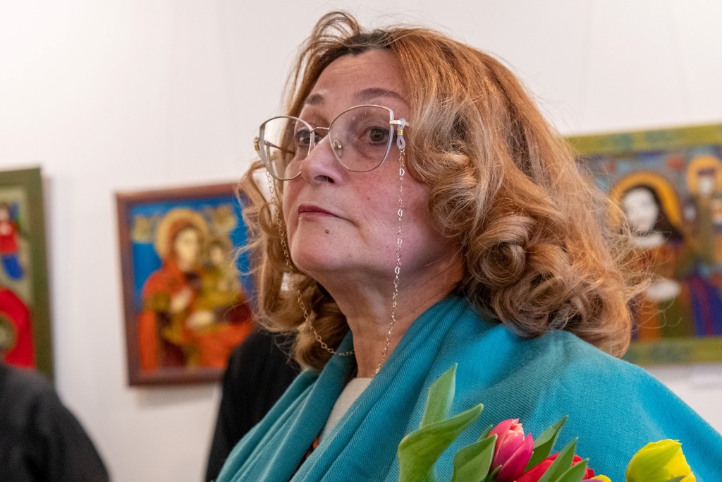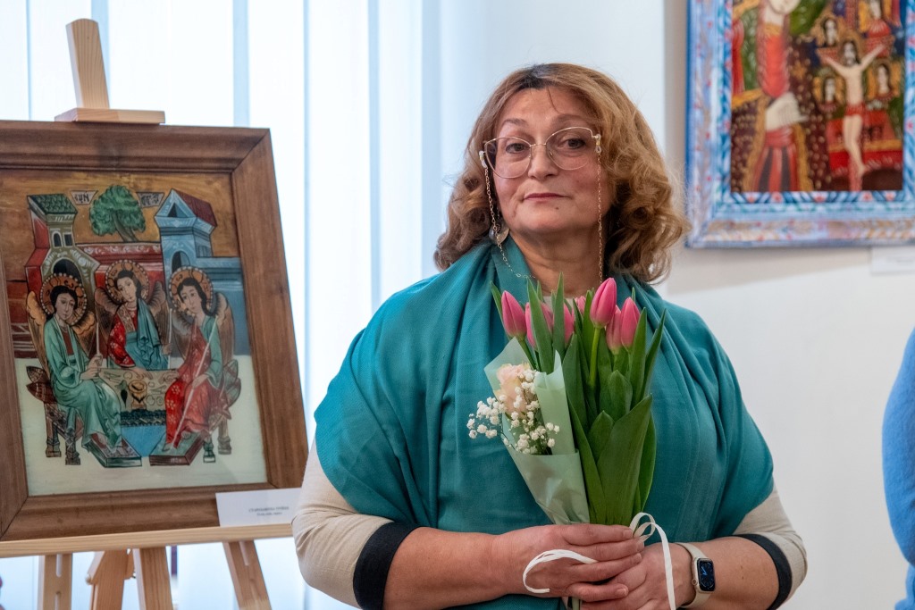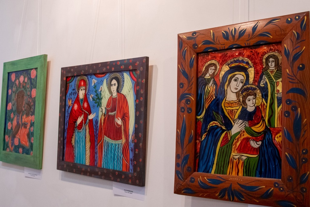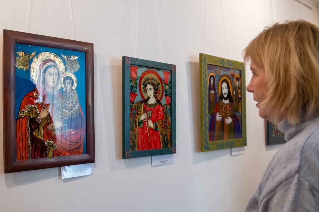 Свої ікони, виписані на склі, професійна художниця і викладачка Арт-студії «Пятерня» виставляє вперше, хоч працює у цій техніці понад 20 років. Її сакральний доробок здебільшого живе у людських домівках. І настільки гармонійно вписався в атмосферу обійсть, що далеко не всі власники погодилися надати образи для виставки.