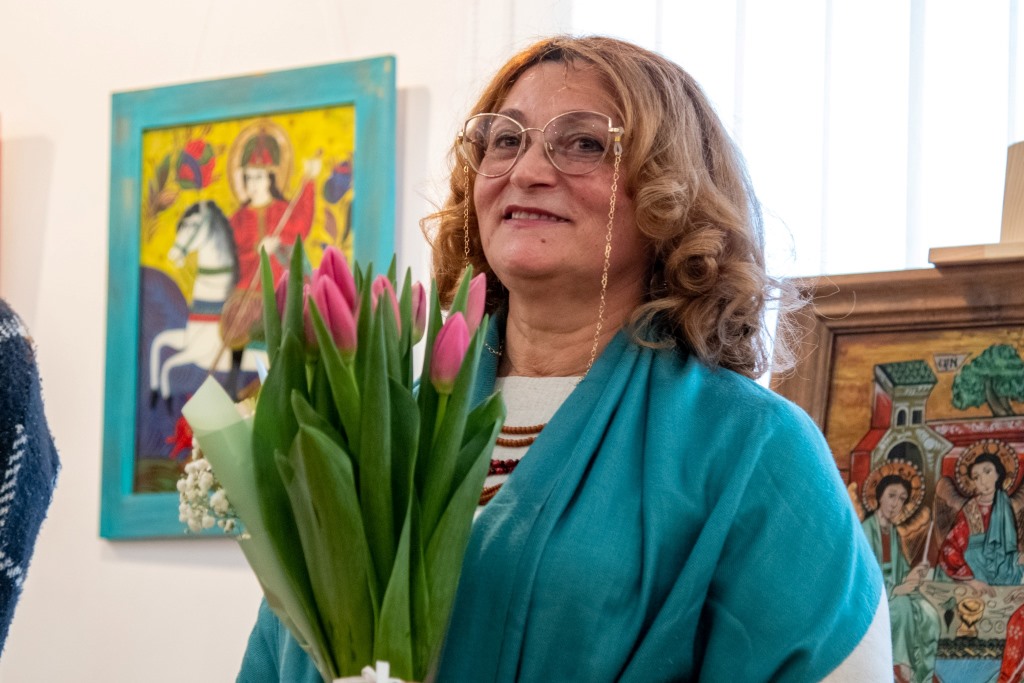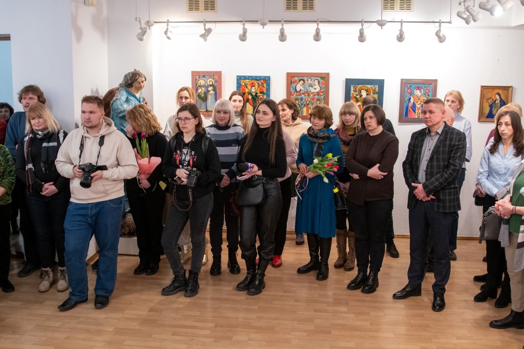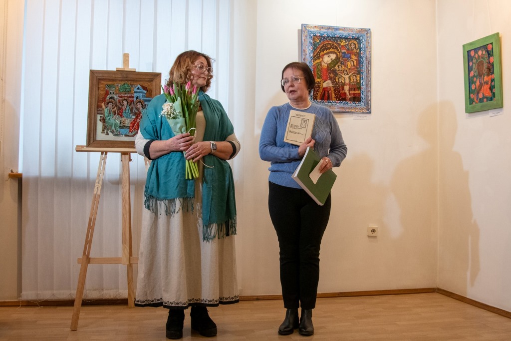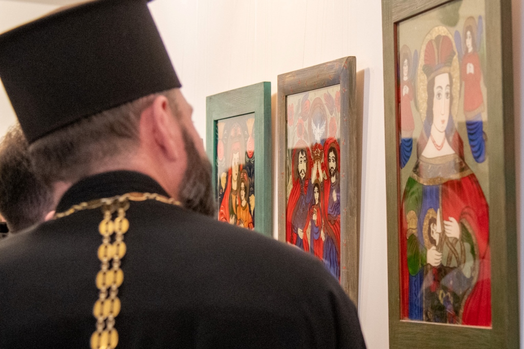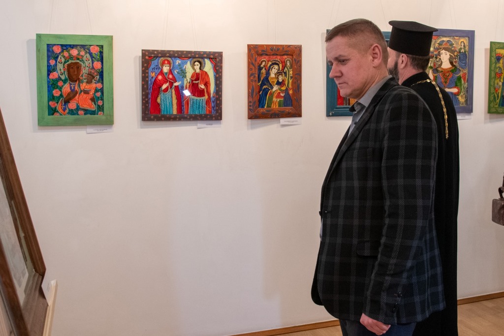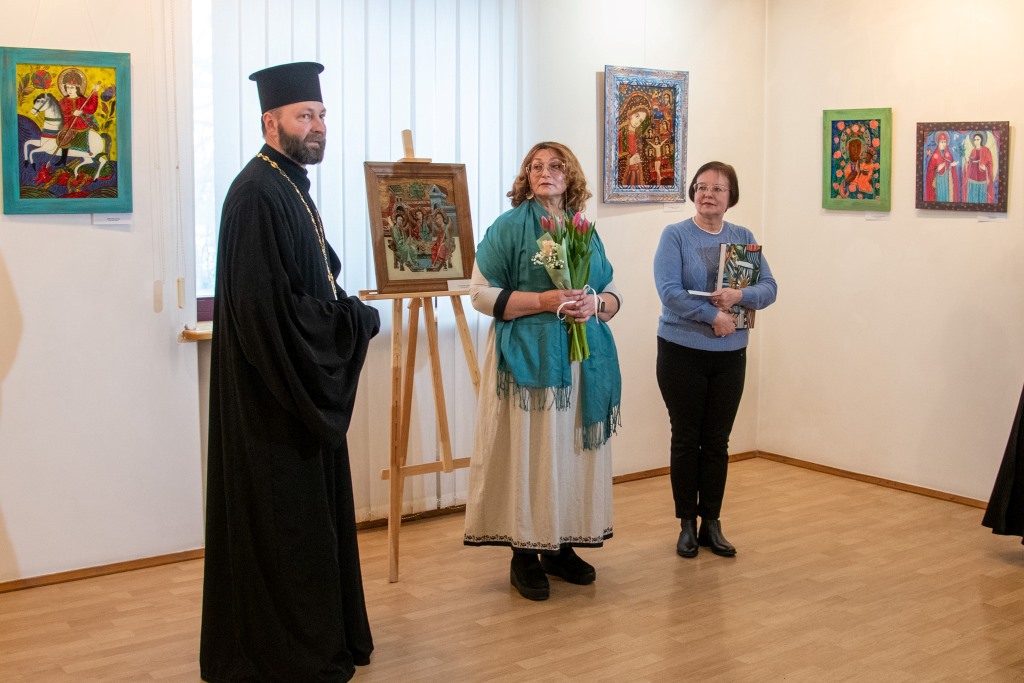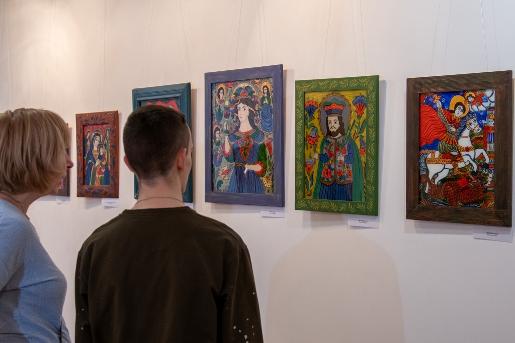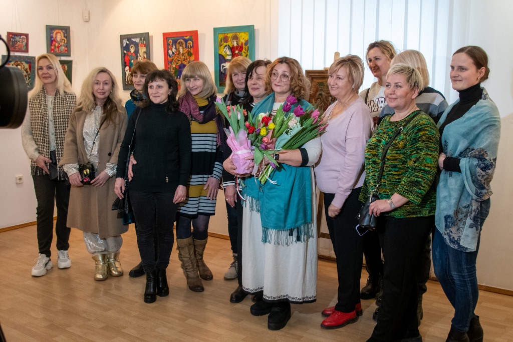 Свої ікони, виписані на склі, професійна художниця і викладачка Арт-студії «Пятерня» виставляє вперше, хоч працює у цій техніці понад 20 років. Її сакральний доробок здебільшого живе у людських домівках. І настільки гармонійно вписався в атмосферу обійсть, що далеко не всі власники погодилися надати образи для виставки.