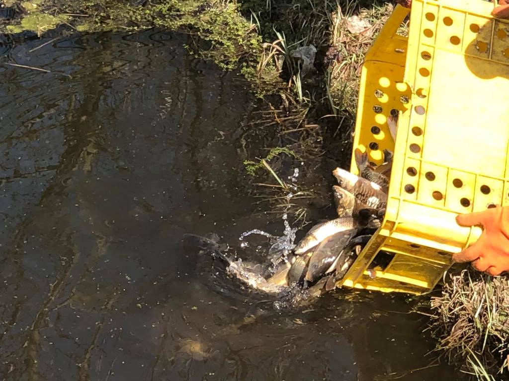 Продовжують зариблення каналів в Центральному парку. Сьогодні в канали випустили понад 150 кілограмів коропа і білого амура для посилення біомеліорації каналів.