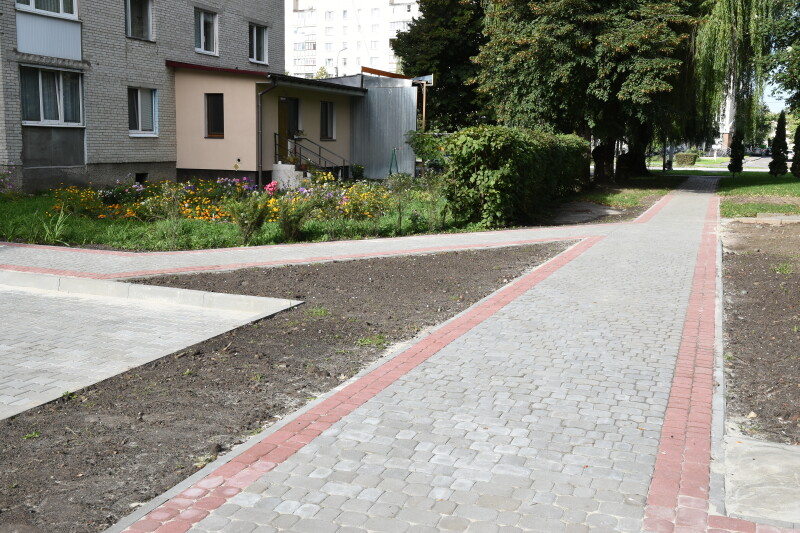На прибудинковій території на проспекті Соборності, 5 завершили вкладати бруківку, провели освітлення.