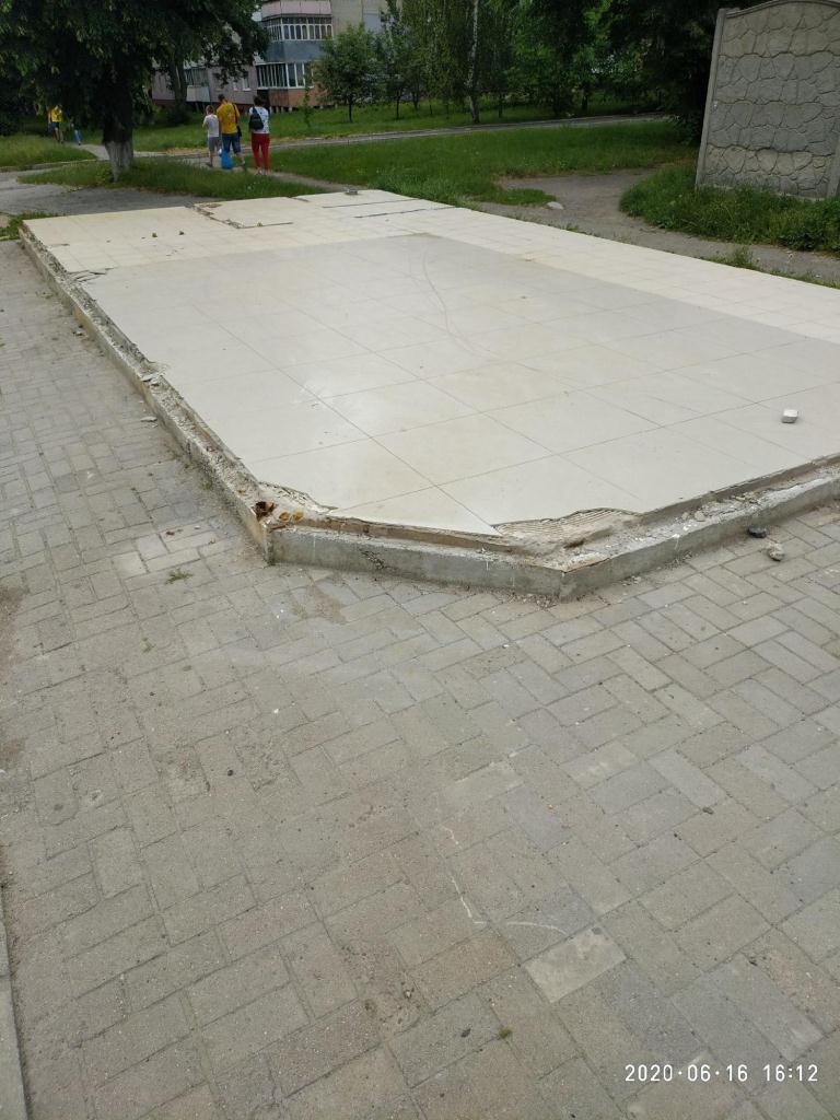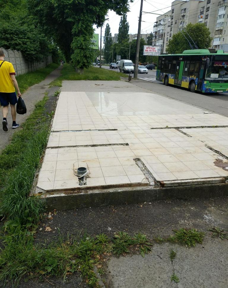 «Після демонтажу тимчасової споруди на зупинці громадського транспорту, залишили фундамент споруди із керамічною плиткою. Для безпеки пішоходів та пасажирів потрібно демонтувати залишки фундаменту.