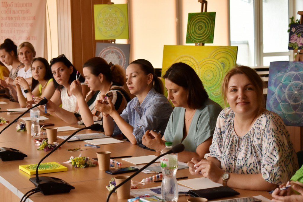 З цікавістю і гумором учасниці зустрічі долучились до створення мандали – кругових малюнків, що відображають психологічну та емоційну цілісність людей, які їх створюють. Надихала та зосереджувала на усвідомленні творчого процесу арт-терапевтка Юлія Гринчук.