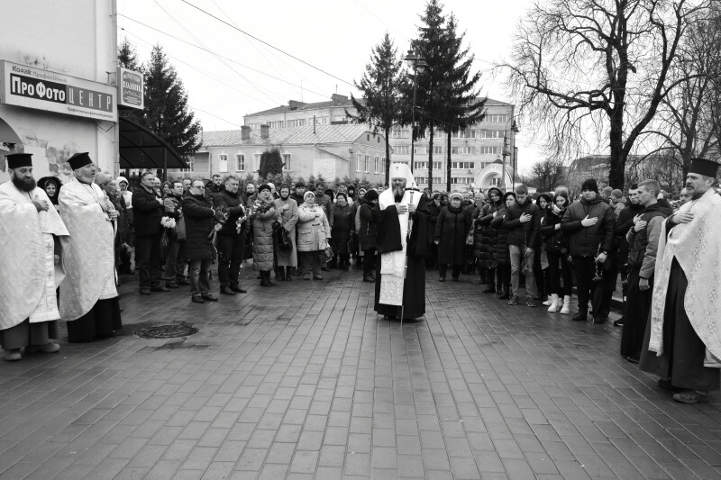 Після завершення панахиди домовини з тілами Героїв прощальною ходою пронесли Театральним майданом. Біля фотостенду “Герої Небесної Сотні – Загинули за єдність України” скорботна процесія зупинилася і виконала Державний Гімн.