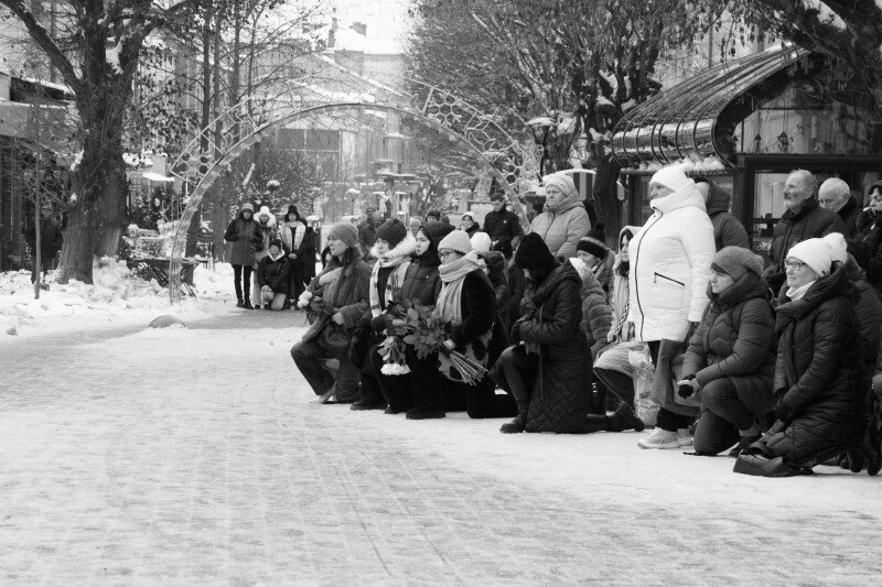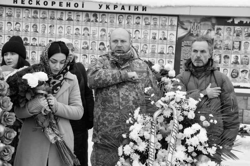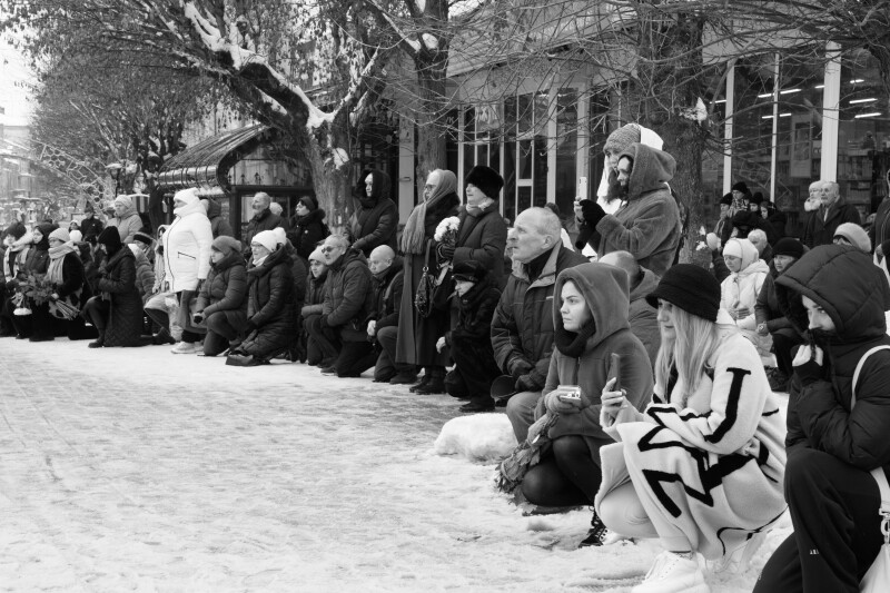 Після завершення панахиди домовини з тілами захисників прощальною ходою пронесли Театральним майданом. Біля фотостенду “Герої Небесної Сотні – Загинули за єдність України” скорботна процесія зупинилася і виконала Державний Гімн.