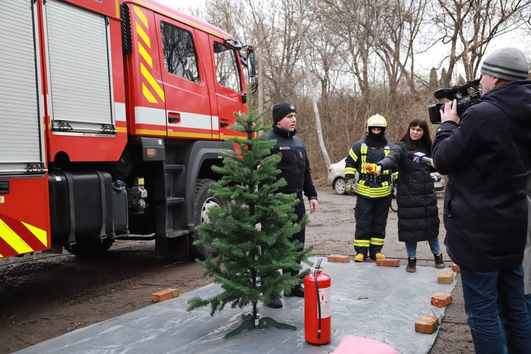 Зокрема на спеціальному майданчику продемонстрували, як гасити ялинку, що загорілася. Відтворили також ситуацію, коли увімкнена гірлянда на ялинці зайнялася – учасники експерименту мали нагоду переконатися, що пожежа з ялинки швидко перекидається на меблі й невдовзі вогонь охоплює кімнату.