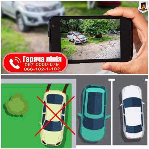 Свідків розміщення транспортних засобів на зеленій зоні, просять телефонувати на гарячу лінію ГШР: 067 000 0 679; 066 102 1 102. Або надсилати інформацію на: Viber, Telegram, WhatsApp.