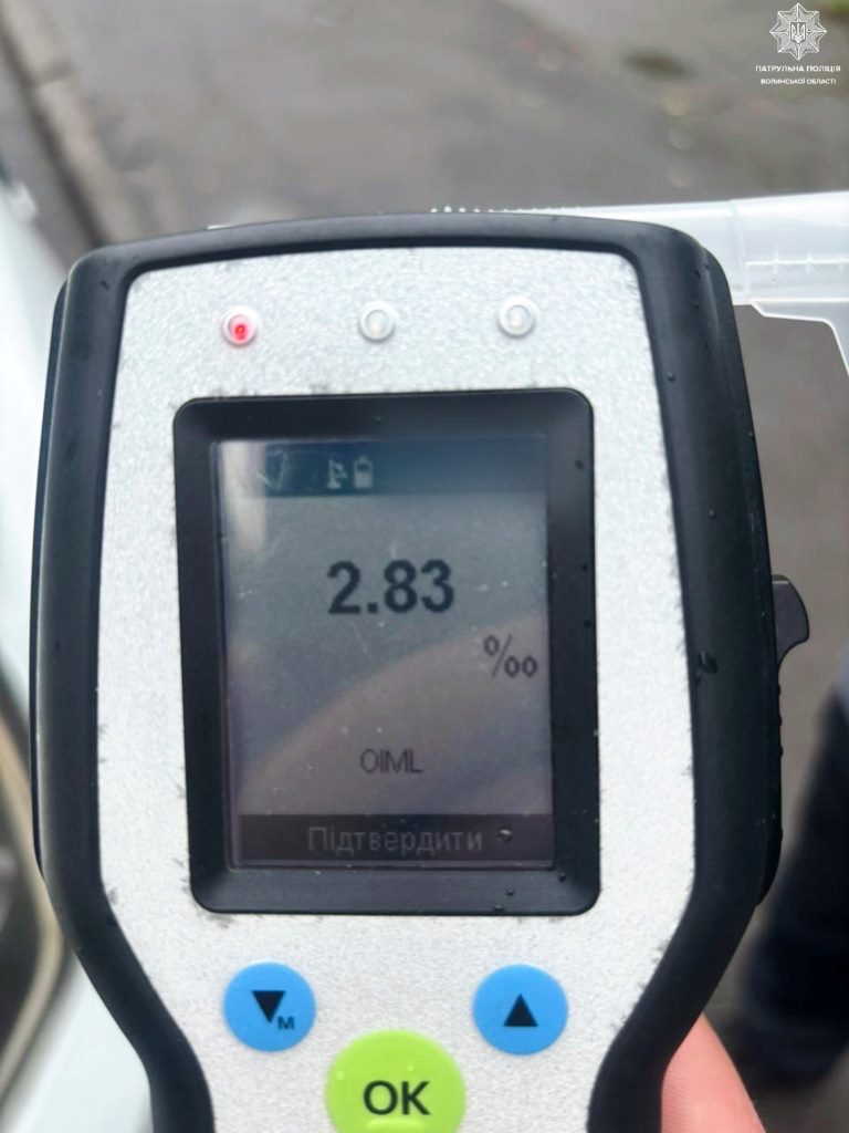 Під час спілкування з водієм інспектори виявили у нього ознаки алкогольного спʼяніння. Чоловік погодився пройти огляд на стан сп’яніння на місці за допомогою приладу Драгер. Результат — 2,83 проміле.