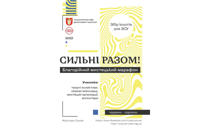 Мистецький марафон «Сильні разом» реалізовує департамент культури Луцької міської ради спільно із закладами культури міської територіальної громади з метою збереження і популяризації національних духовно-культурних цінностей та традицій, утвердження почуття патріотизму та гідності, згуртованості мешканців громади у зв’язку з воєнними діями на території нашої країни.