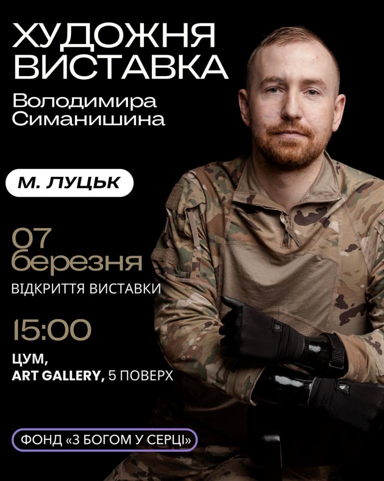 У Луцьку відбудеться перша художня виставка Володимира Симанишина – молодого ветерана російсько-української війни, добровольця, який після важкого поранення втратив обидві руки, пройшов шлях реабілітації та протезування і неочікувано для себе самого знайшов розраду в мистецтві.