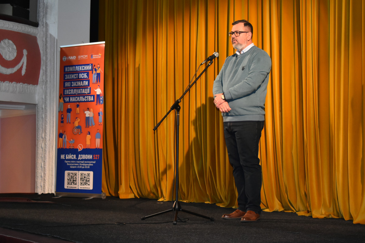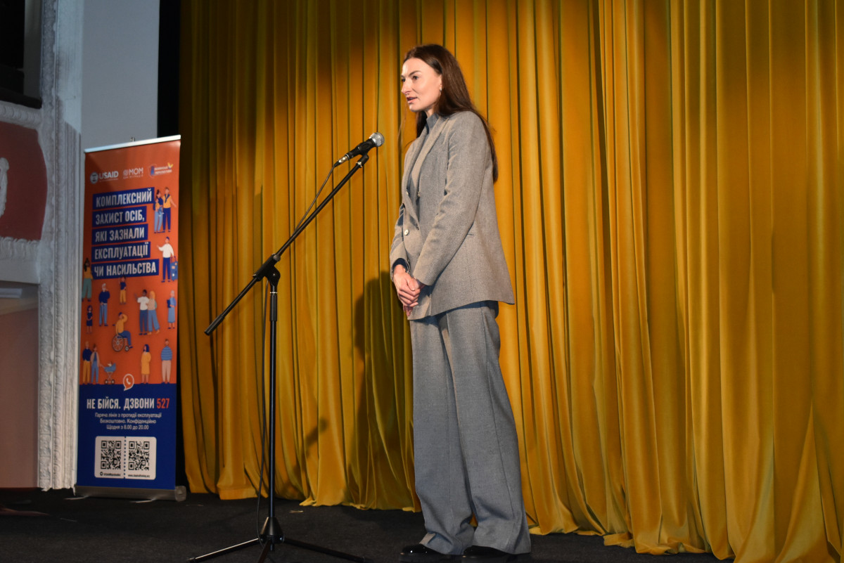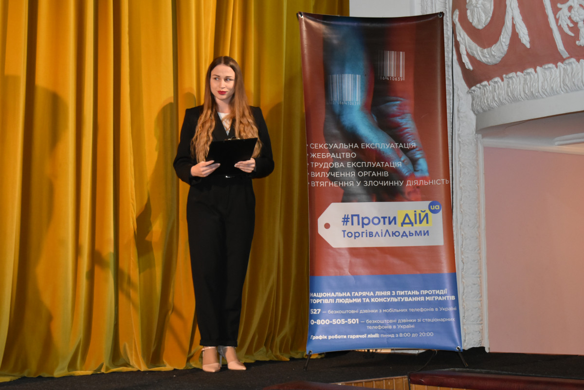 З вітальним словом до присутніх звернулася заступниця голови обласної військової адміністрації Мирослава Якимчук. За її словами, повномасштабна війна змусила багатьох людей покинути власні домівки та поїхати за кордон. Відтак, зросли ризики потрапити в ситуації, що пов’язані з торгівлею людьми. А постраждати від цього явища може будь-яка особа, незалежно від її статі та віку.