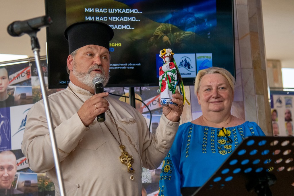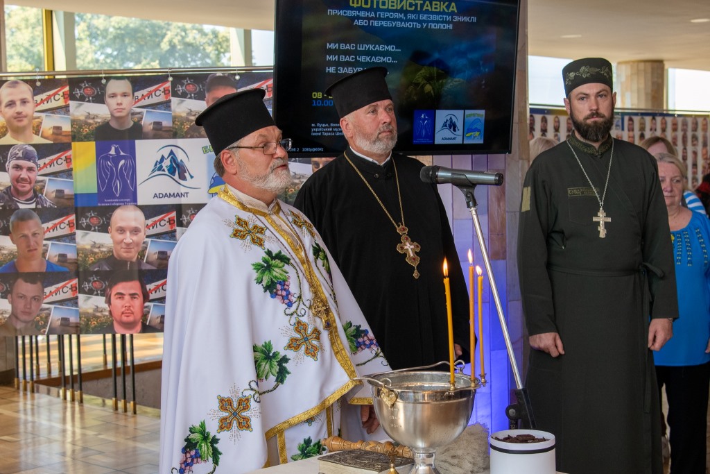 Священники ПЦУ освятили фотовиставку та помолитися за українське воїнство та їхні родини. До присутніх звернувся настоятель Свято-Михайлівського храму, капелан медичної служби, волонтер, отець Степан Гайгель.