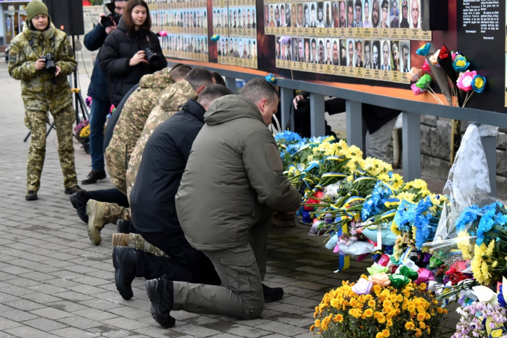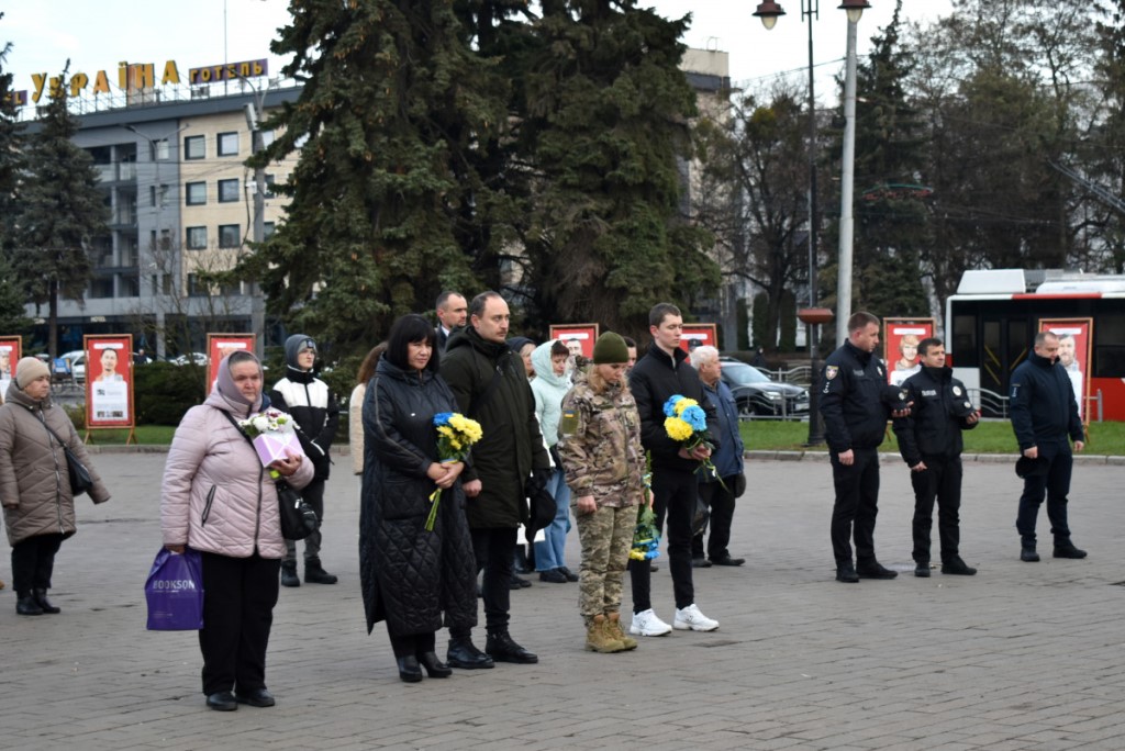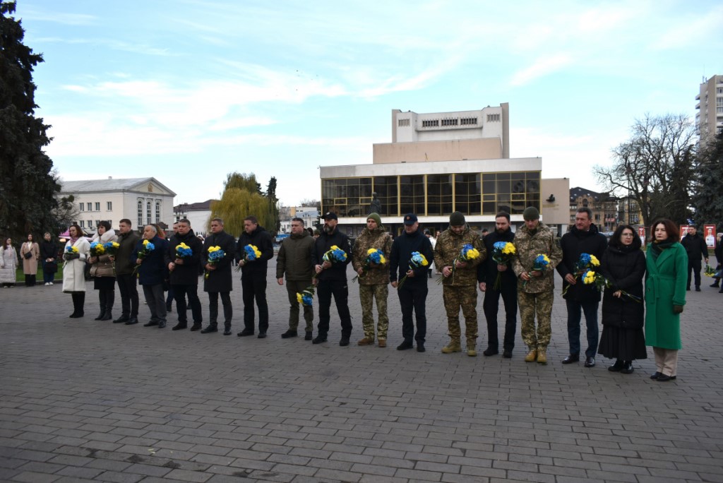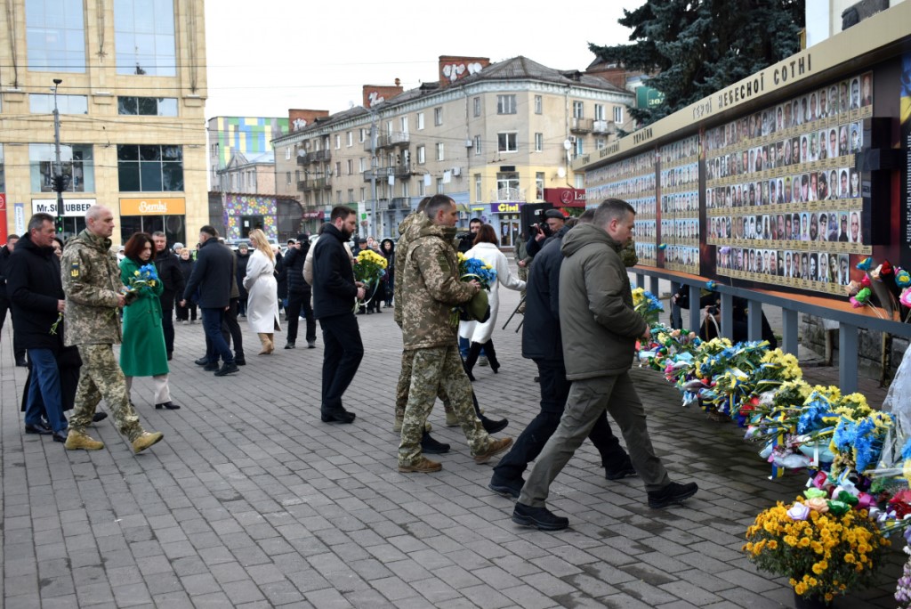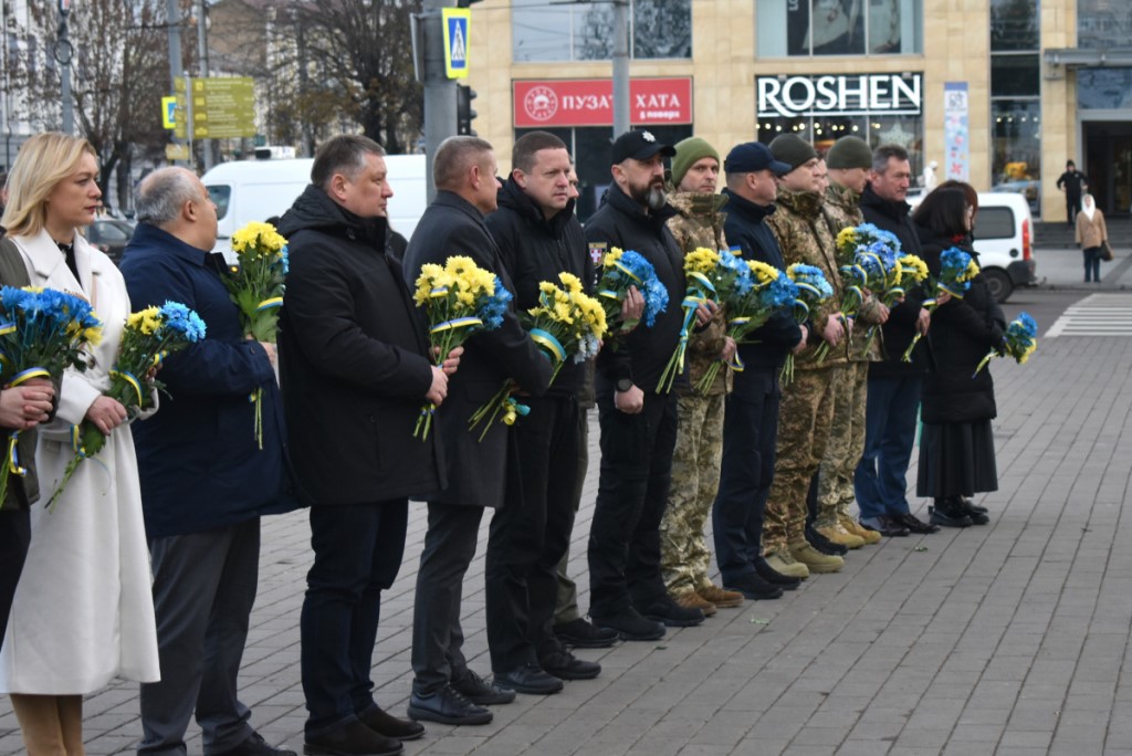 Символічні синьо-жовті квіти поклали до фотостенду Героїв Небесної Сотні волиняни, серед них начальник обласної військової адміністрації Іван Рудницький, представники обласної та міської ради, Луцької районної адміністрації, військові і правоохоронці, громадські активісти.