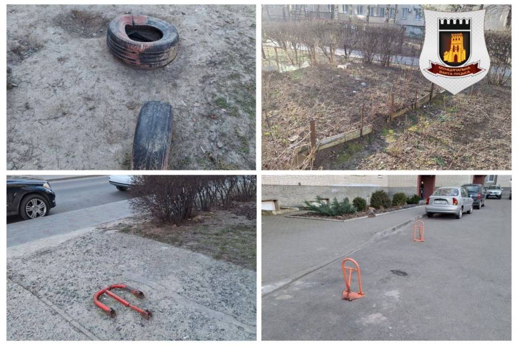 При огляді дворів багатоквартирних будинків та територій загального користування інспектори виявили самочинно розміщені паркувальні бар’єри, старі автомобільні шини, огорожі з городами, різноманітні металеві стовпці тощо.