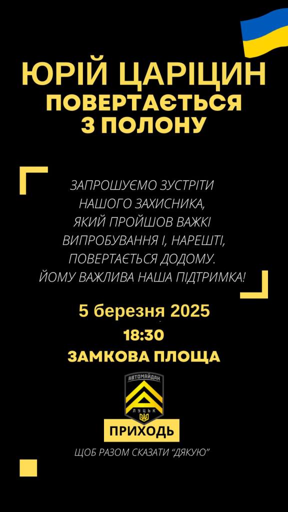 “Тут – рідна земля, рідні люди. Юрій повертається, бо живий. Бо сильний. Бо наш. Сьогодні о 18:30 на Замковій площі Волинь зустріне свого Воїна. Приходьте. Це найменше, що ми можемо зробити”, – йдеться у повідомленні.