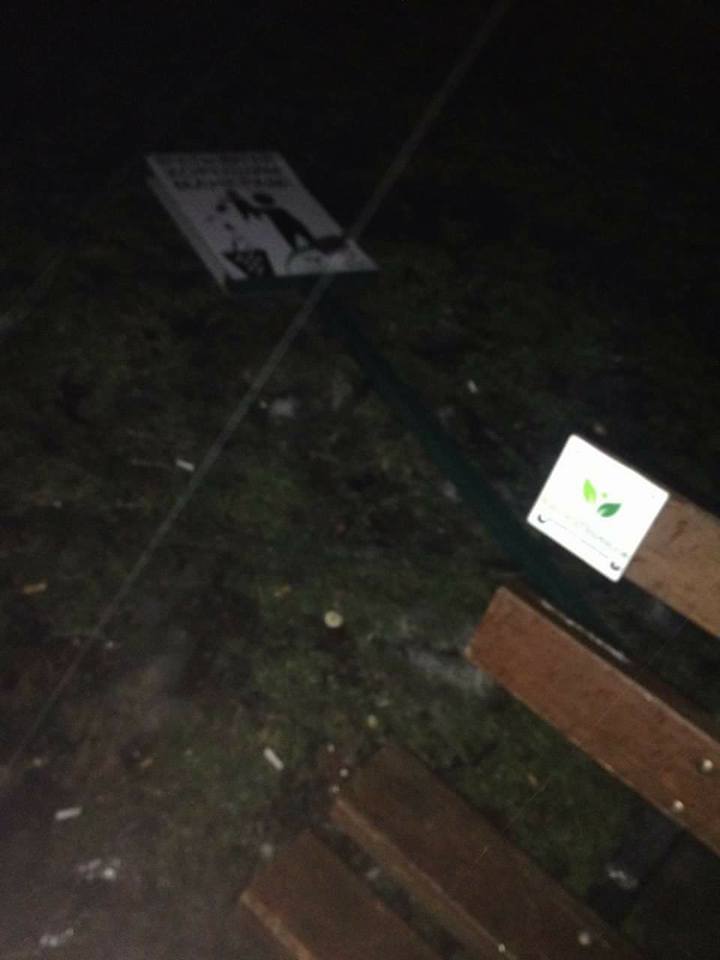 Заступивши на чергування, інспектори департаменту муніципальної варти помітили, що невідомі особи зруйнували інформаційну табличку про заборону викидання сміття в парку та смітник, забетонований в землю.