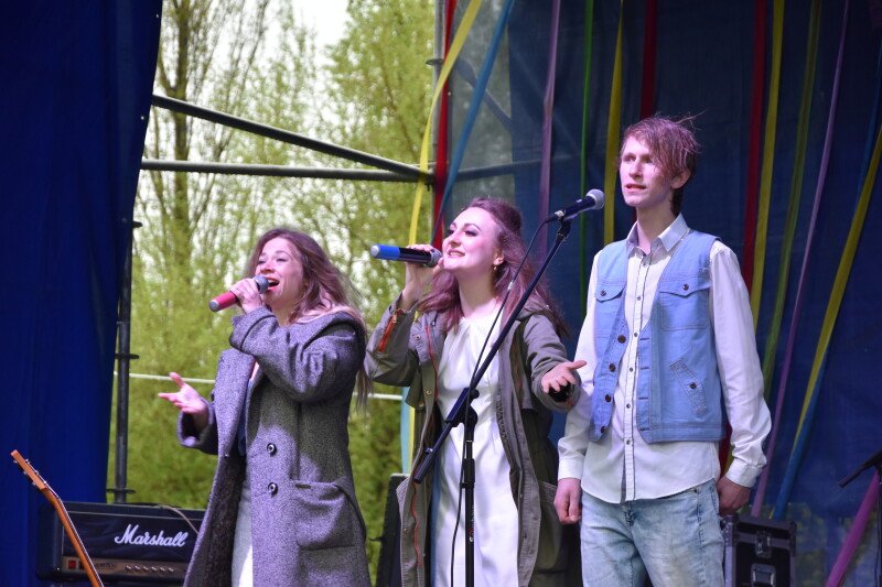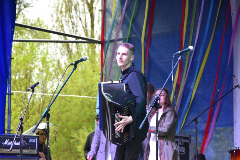 На фестивальній сцені, яка розмістилась біля головного входу у центральний парк культури та відпочинку імені Лесі Українки, зігрівали глядачів своїм співом прекрасні колективи: вокальний гурт “Нота Нео”, вокальний ансамбль “Аколада”.