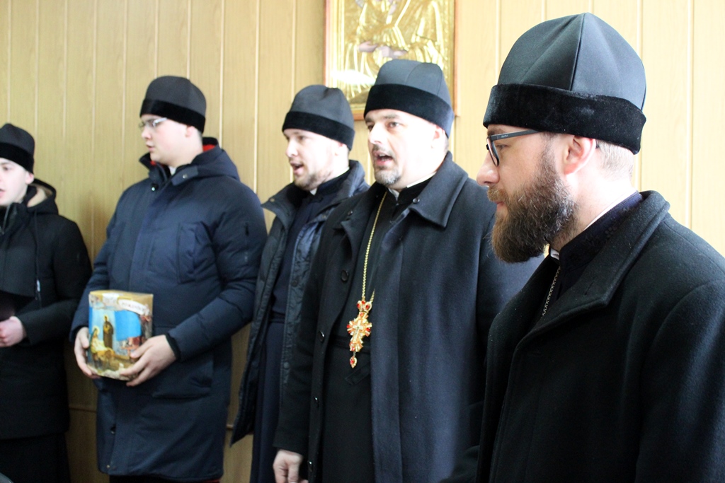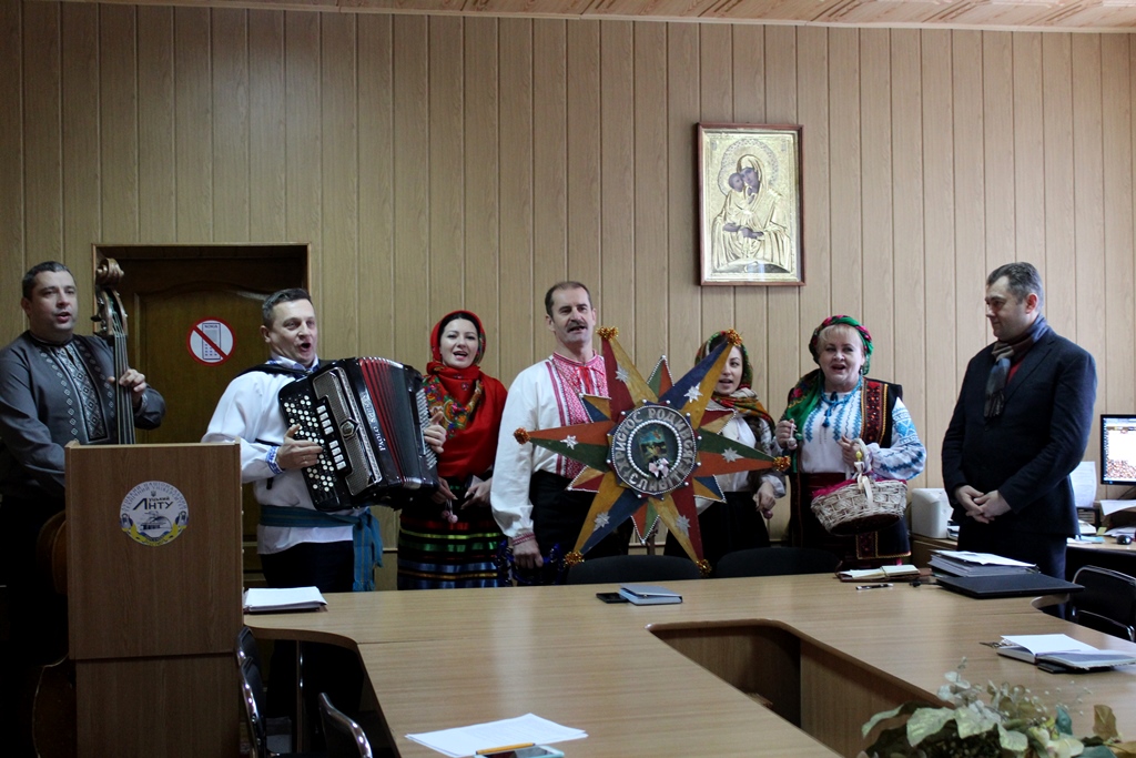 Потому до святкових привітань та з колядою доєдналися гості та колеги Луцького НТУ – священнослужителі та семінаристи Волинської православної богословської академії на чолі з ректором отцем Володимиром Вакіним. Вони заспівали різдвяних пісень «Ой чи є, чи нема Пан Господар вдома», «А у Вифлиємі сталася новина», «Дивная новина», «Чути дзвінок».