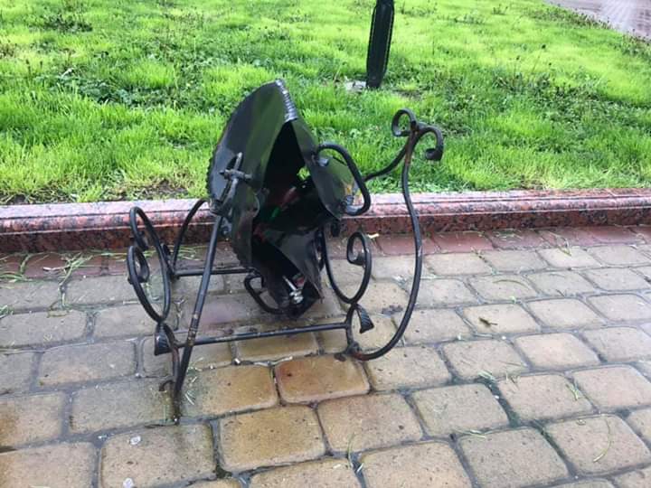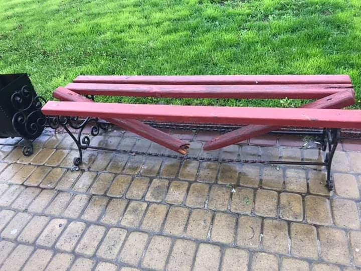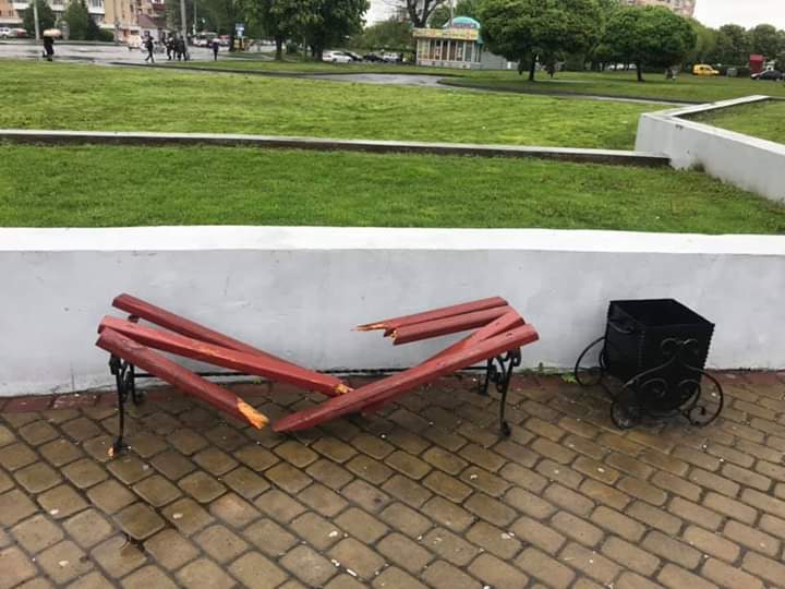 “То мабуть був сильний вітер, поламав лавки і смітник погнув, або можливо, дощем побило. От тільки шкода що комусь руки не повідривало тим вітром і шию не зкрутило”, — йдеться у дописі.