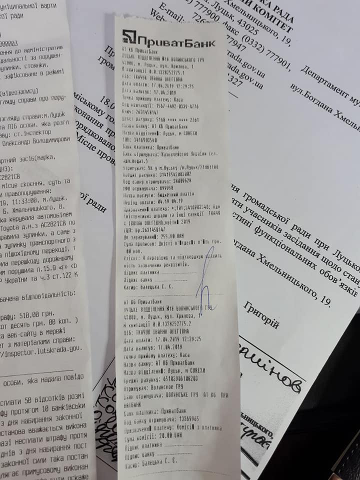 Перший штраф за порушення правил зупинки, стоянки, паркування транспортних засобів у місті Луцьку, зафіксоване в режимі фотозйомки (відеозапису) оплатила свідома громадянка, яка здійснила зупинку свого транспортного засобу на пішохідному переході на вул. Богдана Хмельницького, що у місті Луцьку.