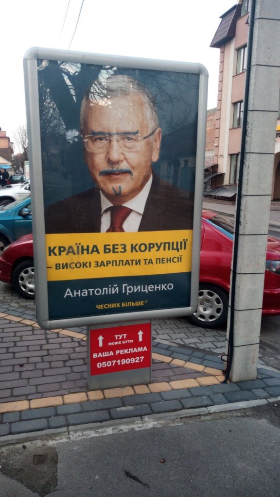 Так, пошкоджені агітаційні матеріали Анатолія Гриценка виявили на вул. Коперника. На сітілайті із гаслом «Країна без корупції – високі зарплати та пенсії. Анатолій Гриценко, чесних більше» на портреті кандидата невідомі домалювали брови, вуса та бороду синім кольором.