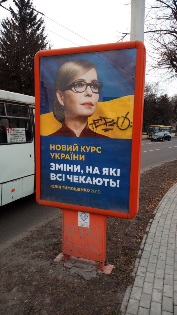 Сітілайт з зображенням Юлії Тимошенко пошкодили на пр. Василя Мойсея. Рекламну площину поряд із зображенням обличчя кандидатки розписали балончиком з чорною фарбою.