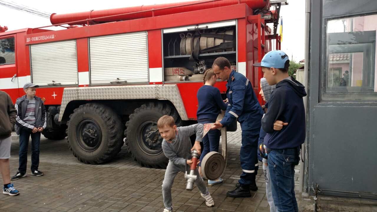 Коротка теоретична частина про правила цивільного захисту – і рятувальників з усіх сторін оточили школярики, бо ж усім хотілося власними руками спробувати подати воду на гасіння умовної пожежі, розкрутити і змотати назад пожежного рукава, приміряти на себе боївку вогнеборця та відчути у власних руках вагу кожного спеціального інструменту тощо.
