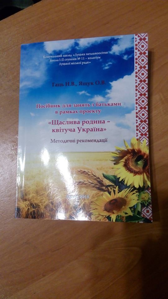 Довідково: соціальний проект «Щаслива родина – міцна Україна» благодійної організації «Фонд розвитку ЗОШ № 11 «Ерудит»» став переможцем Конкурсу соціальних проектів спрямованих на вирішення проблем сімей/осіб, які опинились в складних життєвих обставинах», який проводило управління соціальних служб для сім’ї, дітей та молоді Луцької міської ради. У рамках проекту провели тренінгові заняття з усіма учасниками навчально-виховного процесу – учнями, батьками, класними керівниками та класоводами ЗОШ №11 – колегіуму. Також виготовлено та вручено педагогам посібник із програмою тренінгових занять, методичні рекомендації для батьків.