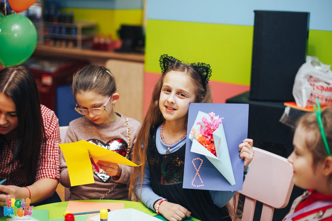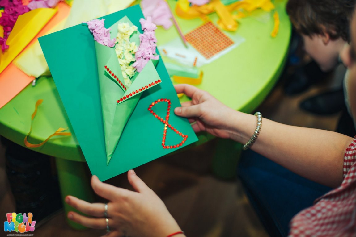 Чимало дітлахів та їх батьків завітали у дитячий розважальний центр «FigliMigli» на свято. Усі малюки долучилися до майстер-класу з виготовлення листівок, які згодом подарували найріднішим. За допомогою кольорового паперу у дітлахів ожили справжні весняні квіти.