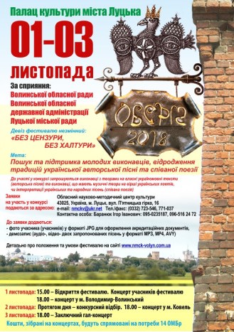 1–3 листопада 2018 року в місті Луцьку вже вдруге відбудеться відновлений Всеукраїнський фестиваль-конкурс авторської пісні та співаної поезії «ОБЕРІГ–2018». Девіз фестивалю –незмінний: «Без цензури, без халтури».