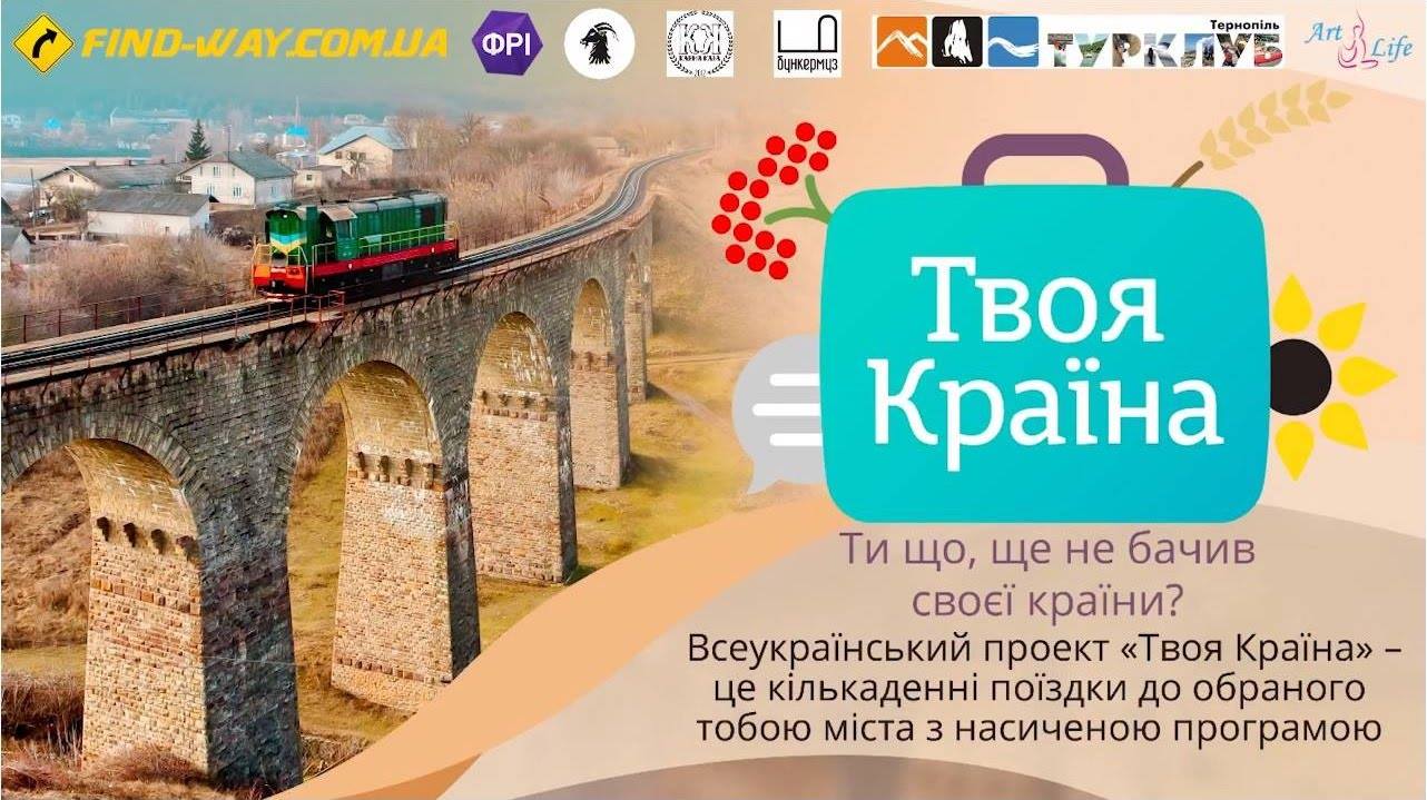 «Твоя країна» — це некомерційний волонтерський рух, що покликаний знайомити молодих українців зі своєю країною та формувати між ними зв’язки. Це кількаденні візити до обраного міста з насиченою програмою: неординарні екскурсії, тренінги та ігри, зустрічі з відомими людьми, квести та ще різні цікаві активності.