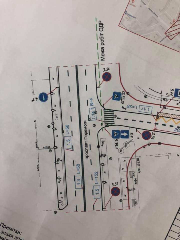 – облаштування трьох смуг руху на перехресті вул. Карпенка-Карого з мостом на пр. Перемоги — права смуга для руху прямо, центральна та ліва смуга — для повороту ліворуч для виїзду на міст.