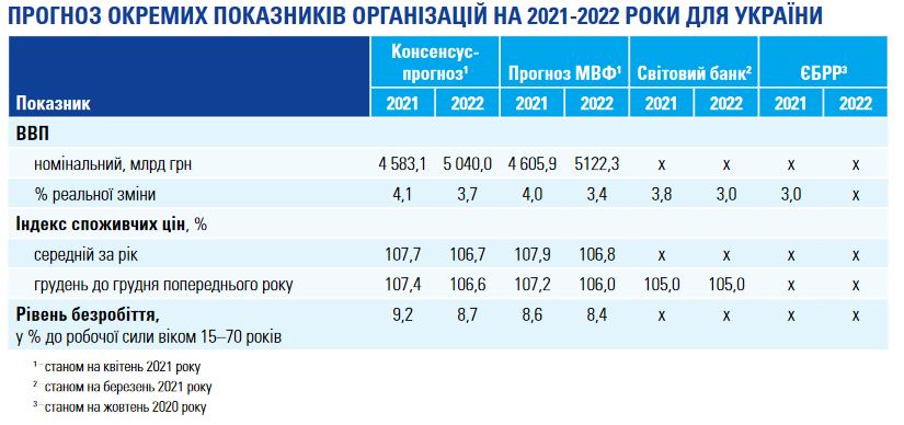 “За прогнозами експертів, очікується зростання ВВП у 2021 році на рівні 4,1 % (порівняно з попередньою оцінкою 3,2 % станом на липень 2020 року) та на 2022 рік прогнозується на рівні 3,7 % (3,5 % попередня оцінка відповідно). Бюджетне стимулювання, запроваджене для підтримки населення та бізнесу, зберігатиме високі позиції, що має своє відображення у розмірі дефіциту бюджету, який за оцінками експертів порівняно з 2020 роком поступово зменшуватиметься, але буде вищим за попередні оцінки (консенсусна оцінка на 2021 рік становить «мінус» 4,9 % від ВВП проти «мінус» 3,4 % попередньої оцінки консенсус-прогнозу, на 2022 рік – «мінус» 4,3 % на відміну від «мінус» 2,8 %)”, – йдеться в повідомленні.
