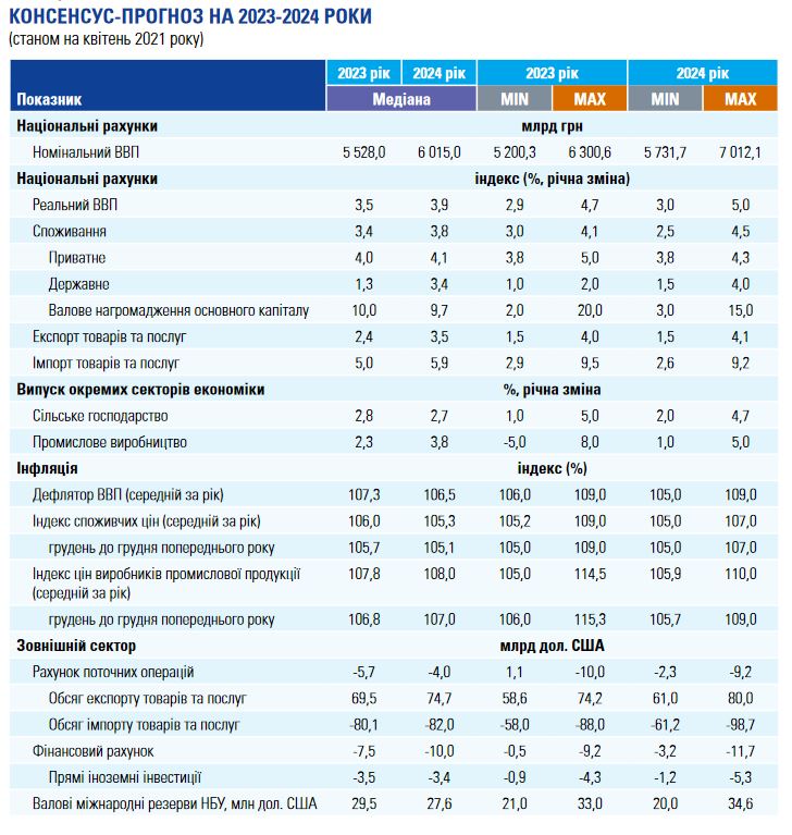 Наведений у публікації прогноз економічного і соціального розвитку України на 2021-2024 роки розрахували на базі матеріалів, наданих експертами Міністерства розвитку економіки, торгівлі та сільського господарства України, Міністерства фінансів України, ДУ “Інститут економіки та прогнозування НАН України”, Державного науково-дослідного інституту інформатизації та моделювання економіки, Інституту еволюційної економіки, Інституту демографії та соціальних досліджень імені М.В. Птухи НАН України, Інституту економічних досліджень та політичних консультацій, Міжнародного центру перспективних досліджень, Інвестиційної банківської компанії ICU, Concorde Capital, CASE Україна, АТ “Укрсиббанк”.
