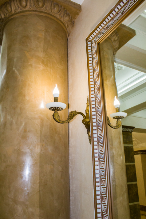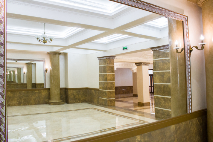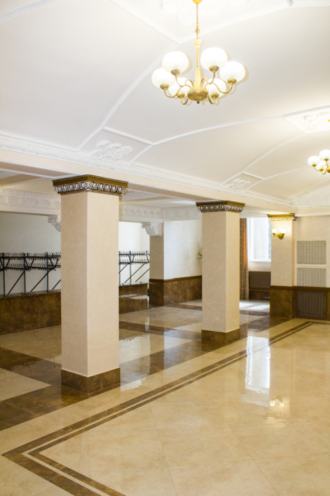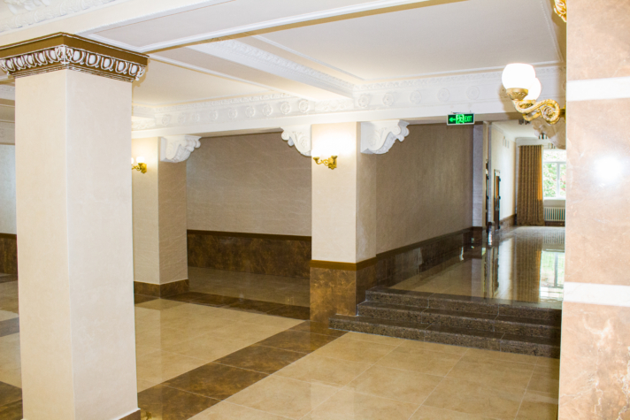 Нижній та верхній зали, а також бічні коридори першого поверху палацу культури у Нововолинську повністю оновили. Стіни та підлогу обклали плиткою, осучаснили колони, замінили вхідні двері та вікна. Гіпсову ліпнину, яка прикрашала приміщення до ремонту вирішили залишити. Встановивши спеціальну підсвітку, її вдало вписали у загальну композицію інтер’єру. Фойє оздобили великими дзеркалами, які візуально розширили простір, надали йому вишуканості та глибини.